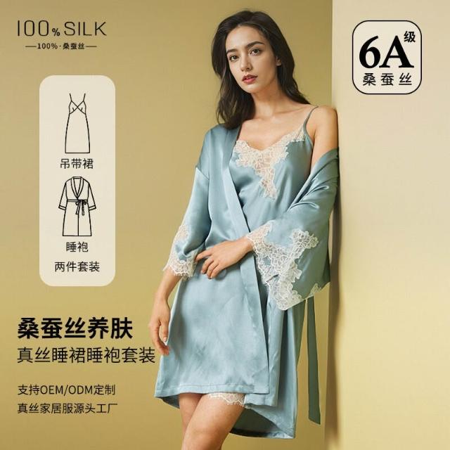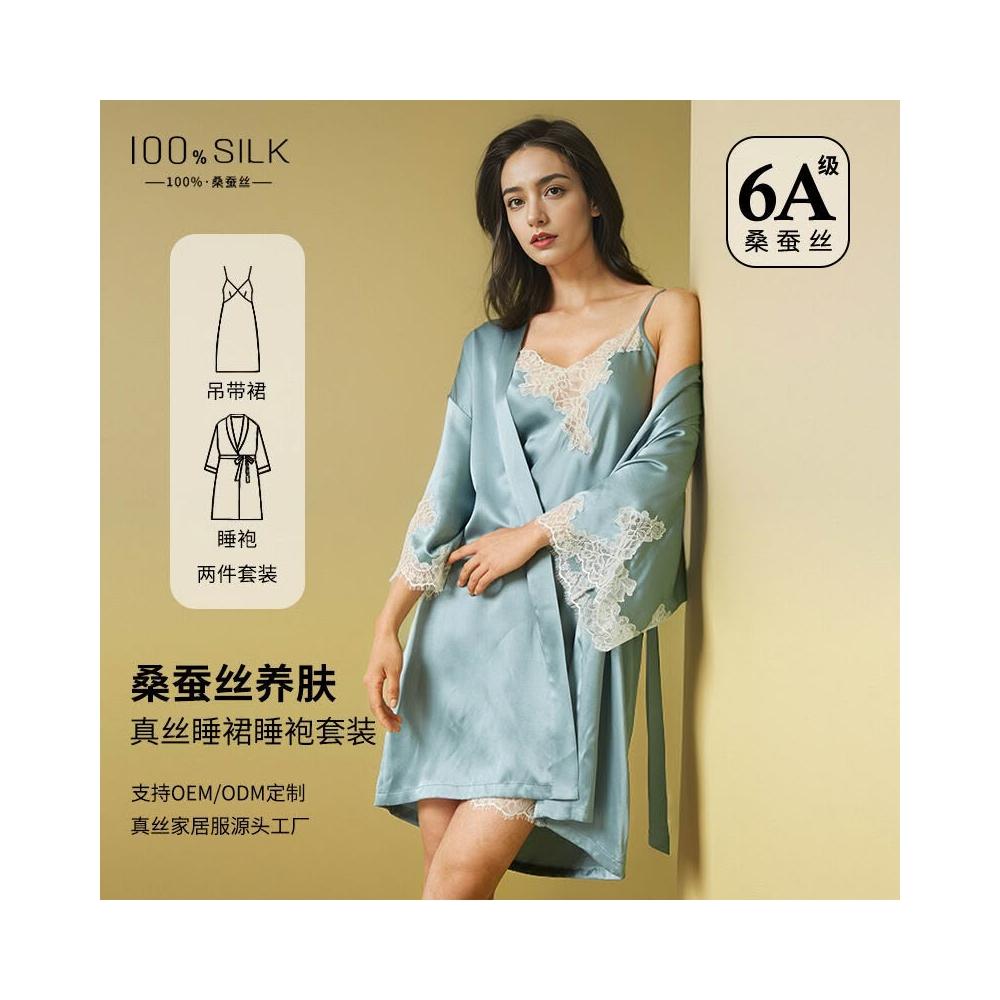 19姆米真絲短裙晨袍兩件套女100%桑蠶絲絲綢家居吊帶睡裙睡袍套裝