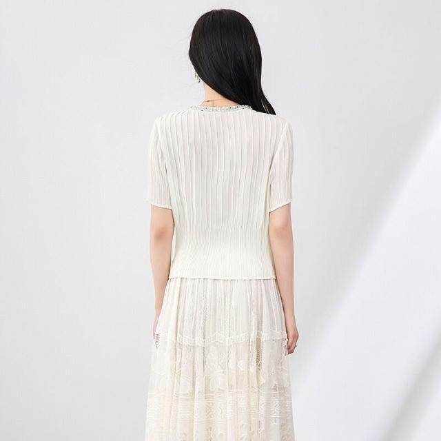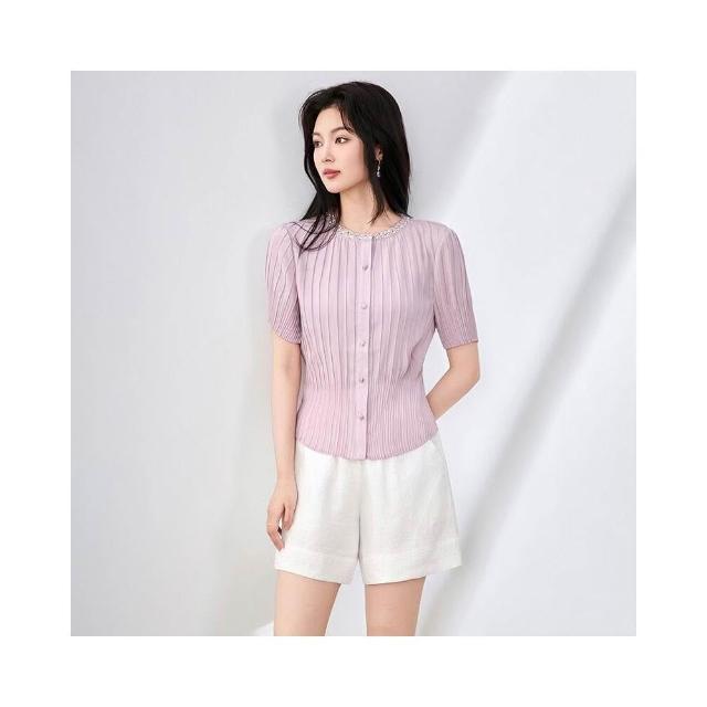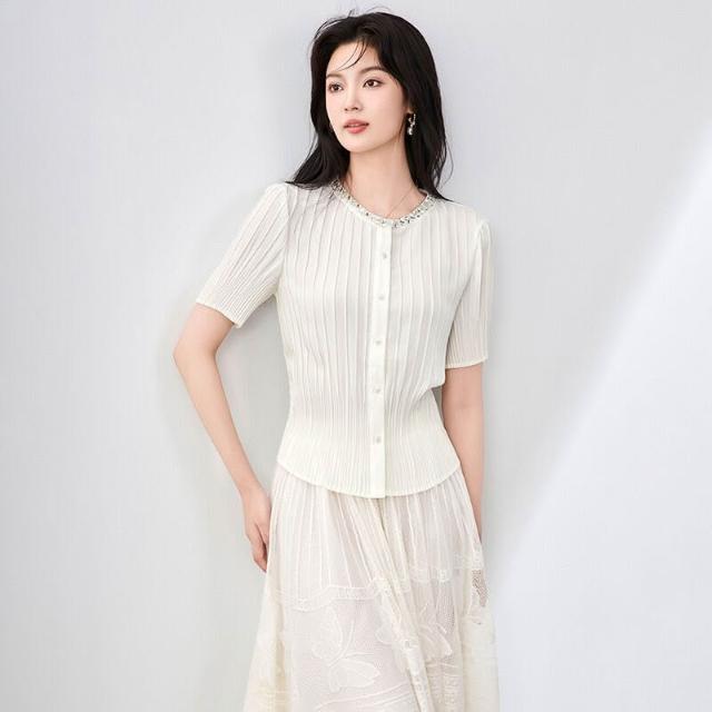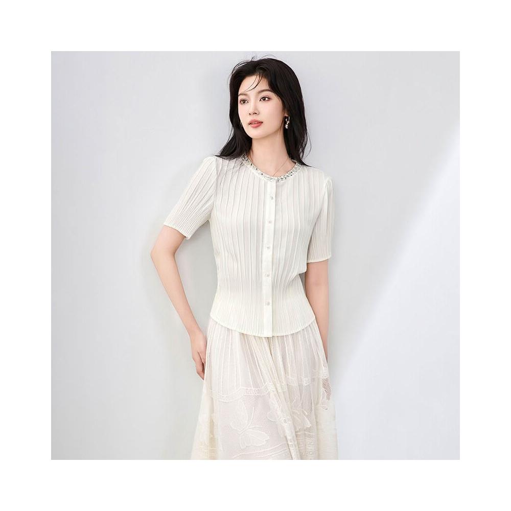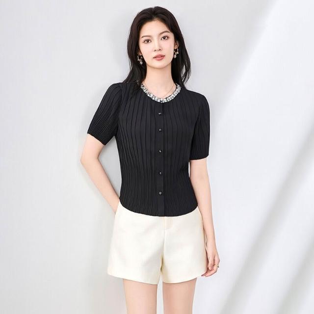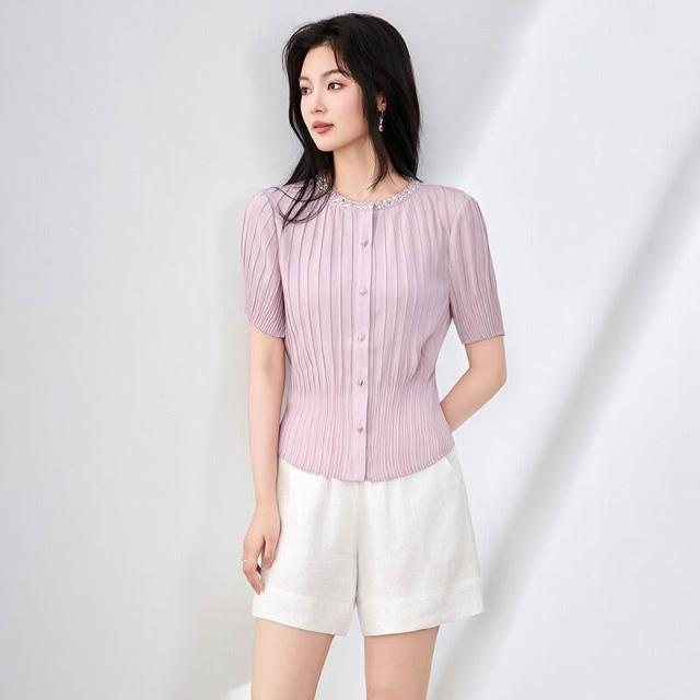 2507212-法式重工釘鉆壓褶雪紡衫上衣洋氣小衫短款修身打底衫女裝