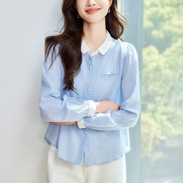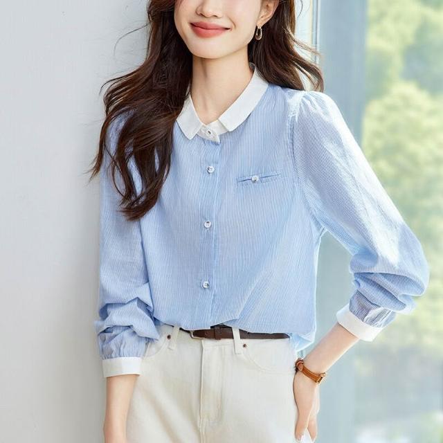JIUCHEN九宸 藍色條紋襯衫女長袖2026春裝新款小方領撞色上衣設計感襯衣