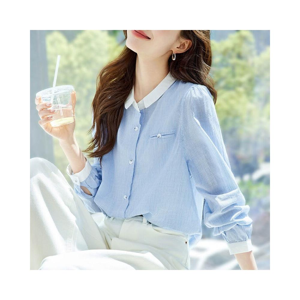 JIUCHEN九宸 藍色條紋襯衫女長袖2026春裝新款小方領撞色上衣設計感襯衣