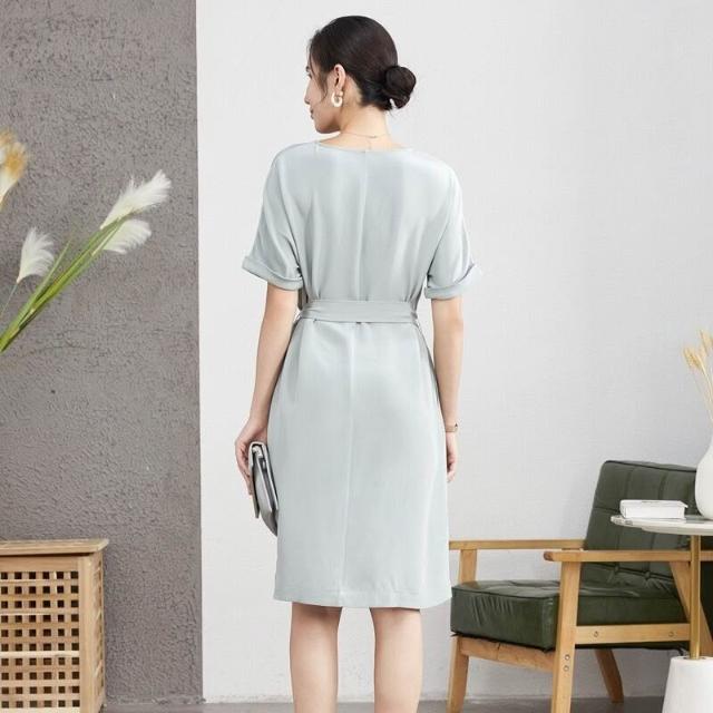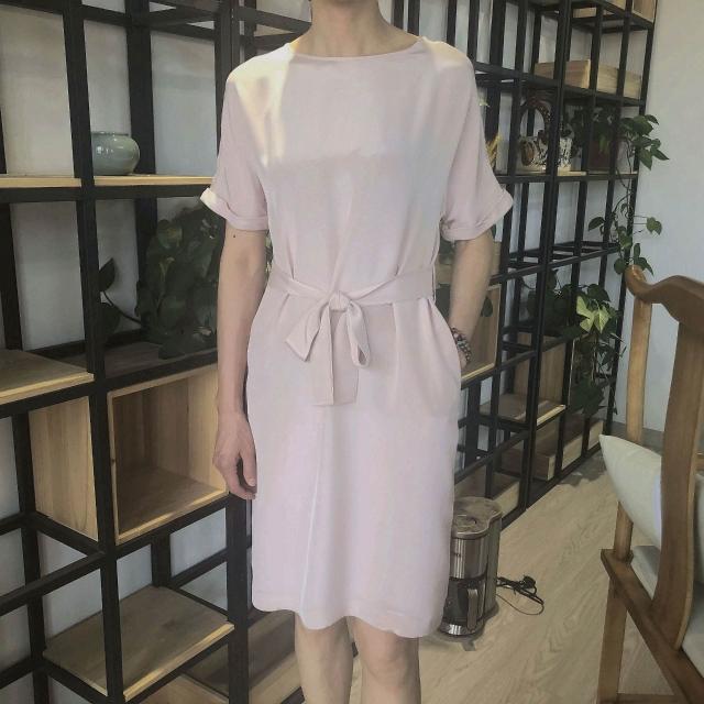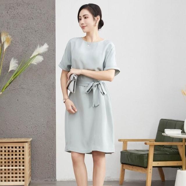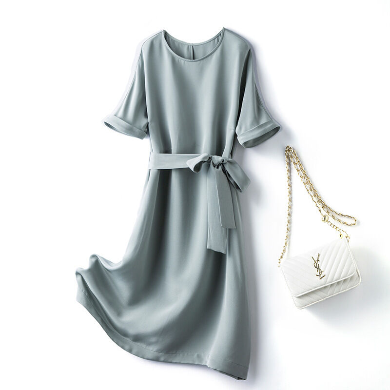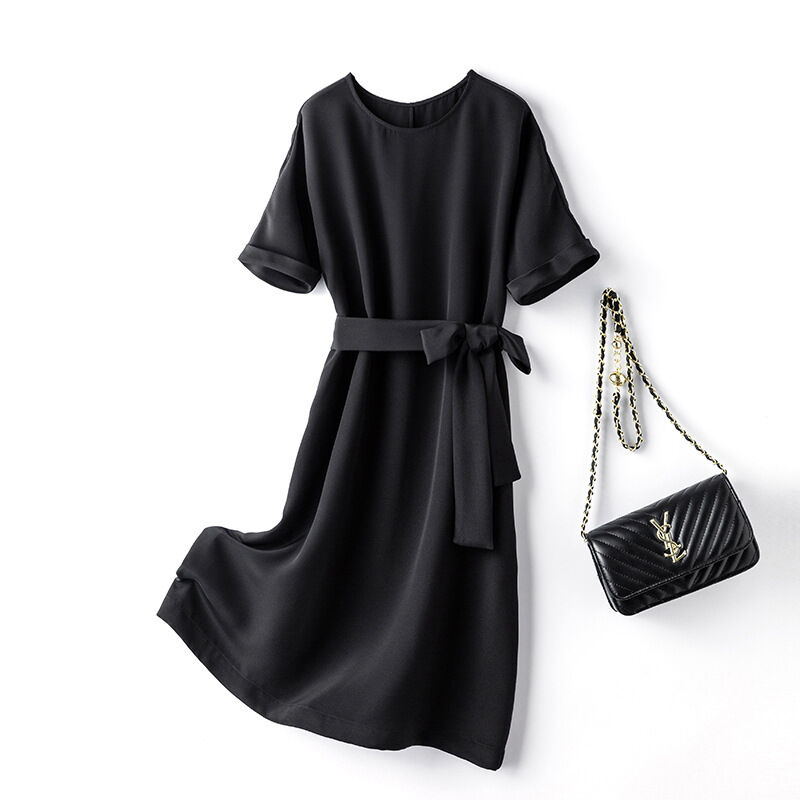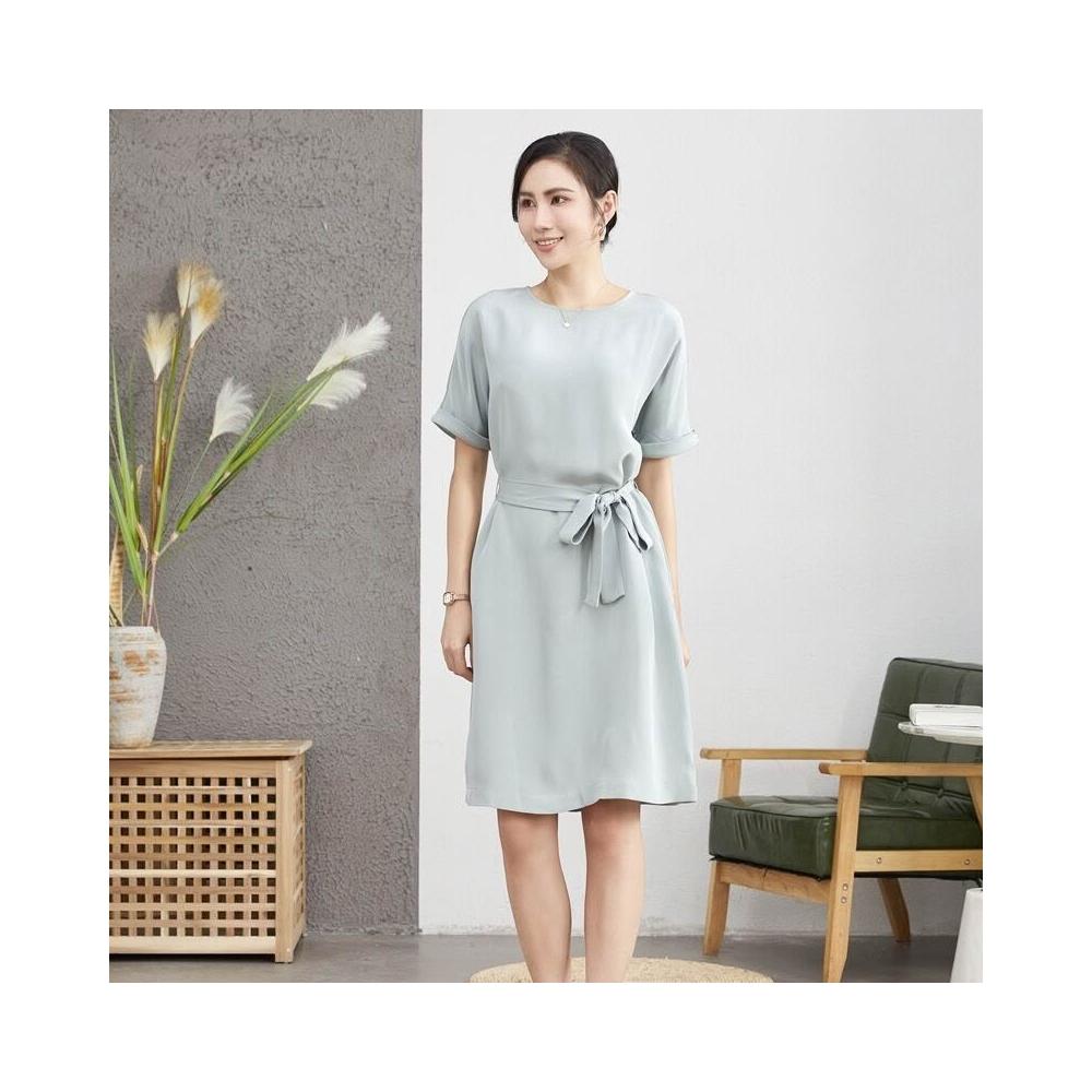 九宸衣櫥 夏季新款重磅真絲桑蠶絲連衣裙女氣質減齡系帶瘦身款A字裙子短袖