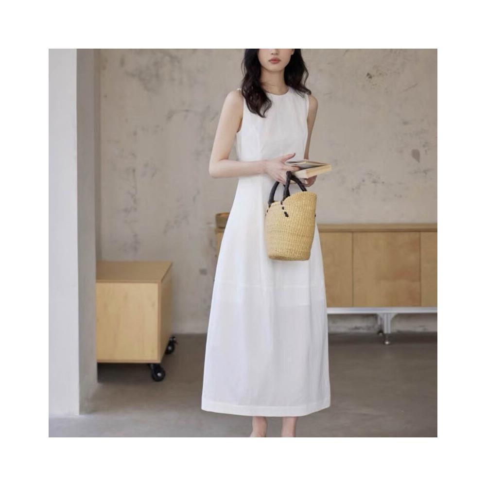 九宸衣櫥 法式無袖白色連衣裙女夏拼接收腰黑色領證背心裙花苞長裙