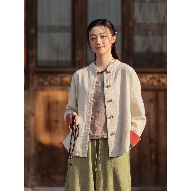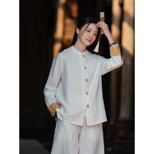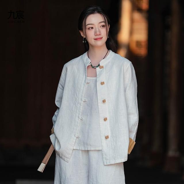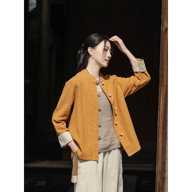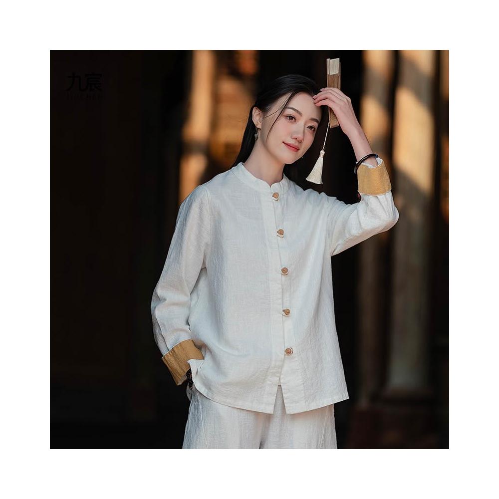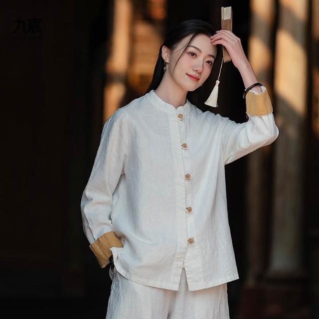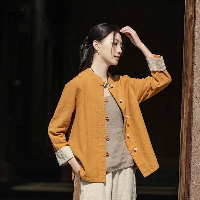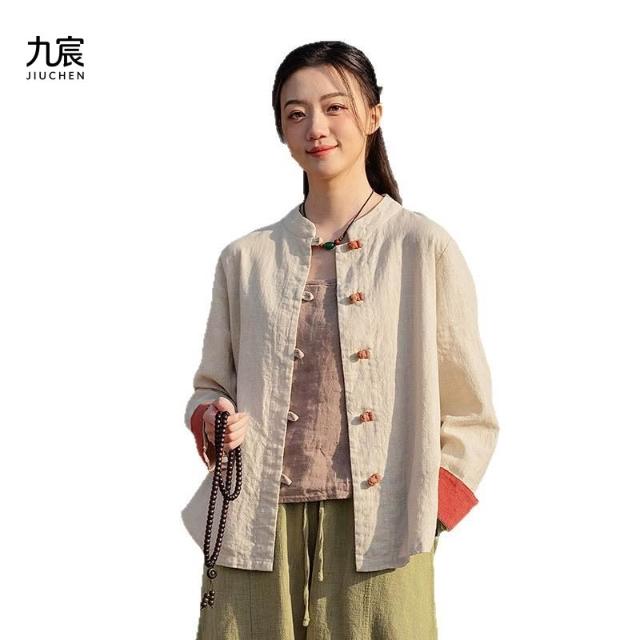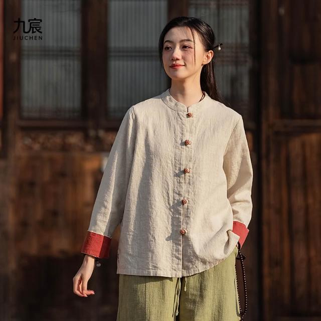 JIUCHEN九宸衣櫥 中式棉麻女裝拼色盤扣襯衫復古亞麻上衣茶服女禅意中山裝國風開衫