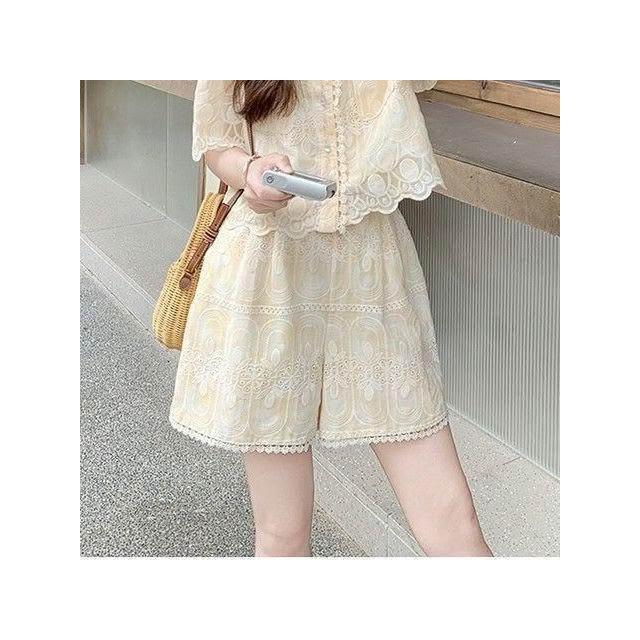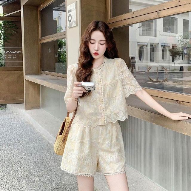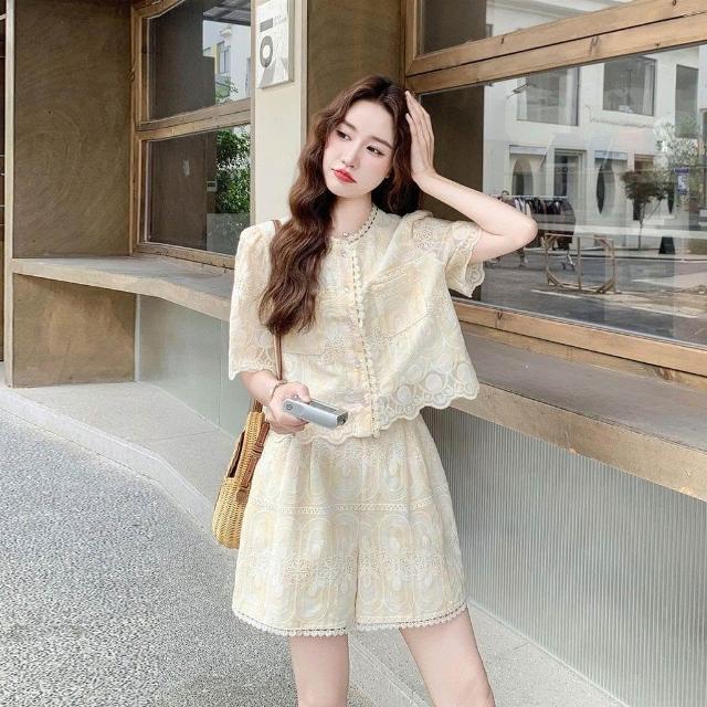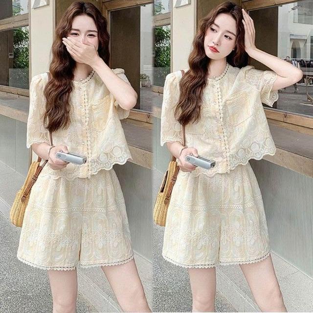 生活首選淺黃色重工刺繡套裝女小個子2026夏新款法式蕾絲上衣闊腿褲兩件套