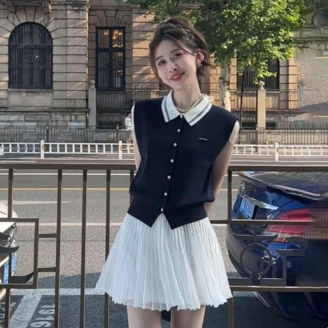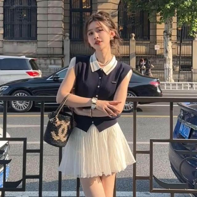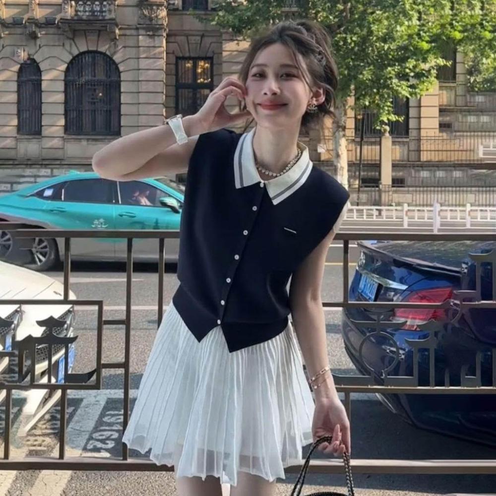 生活首選學院風甜美減齡時尚套裝女韓系風POLO領無袖背心上衣半身裙兩件套