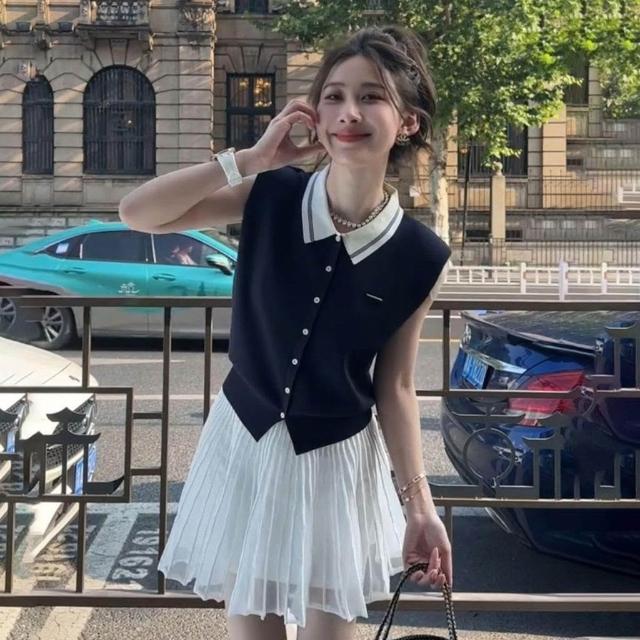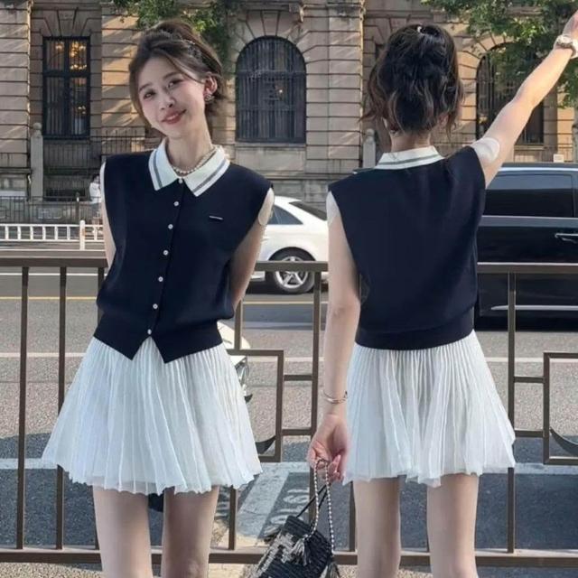生活首選學院風甜美減齡時尚套裝女韓系風POLO領無袖背心上衣半身裙兩件套
