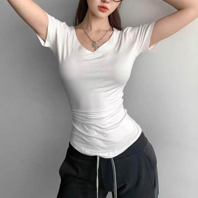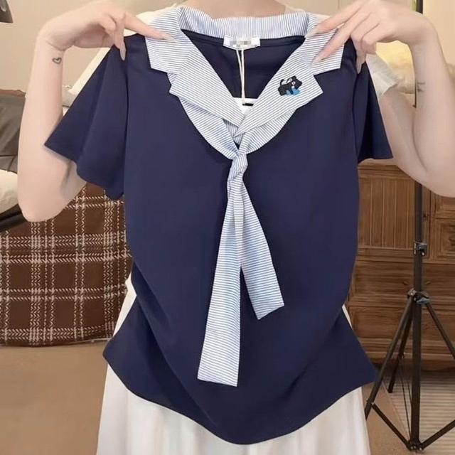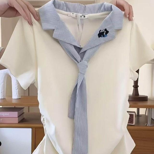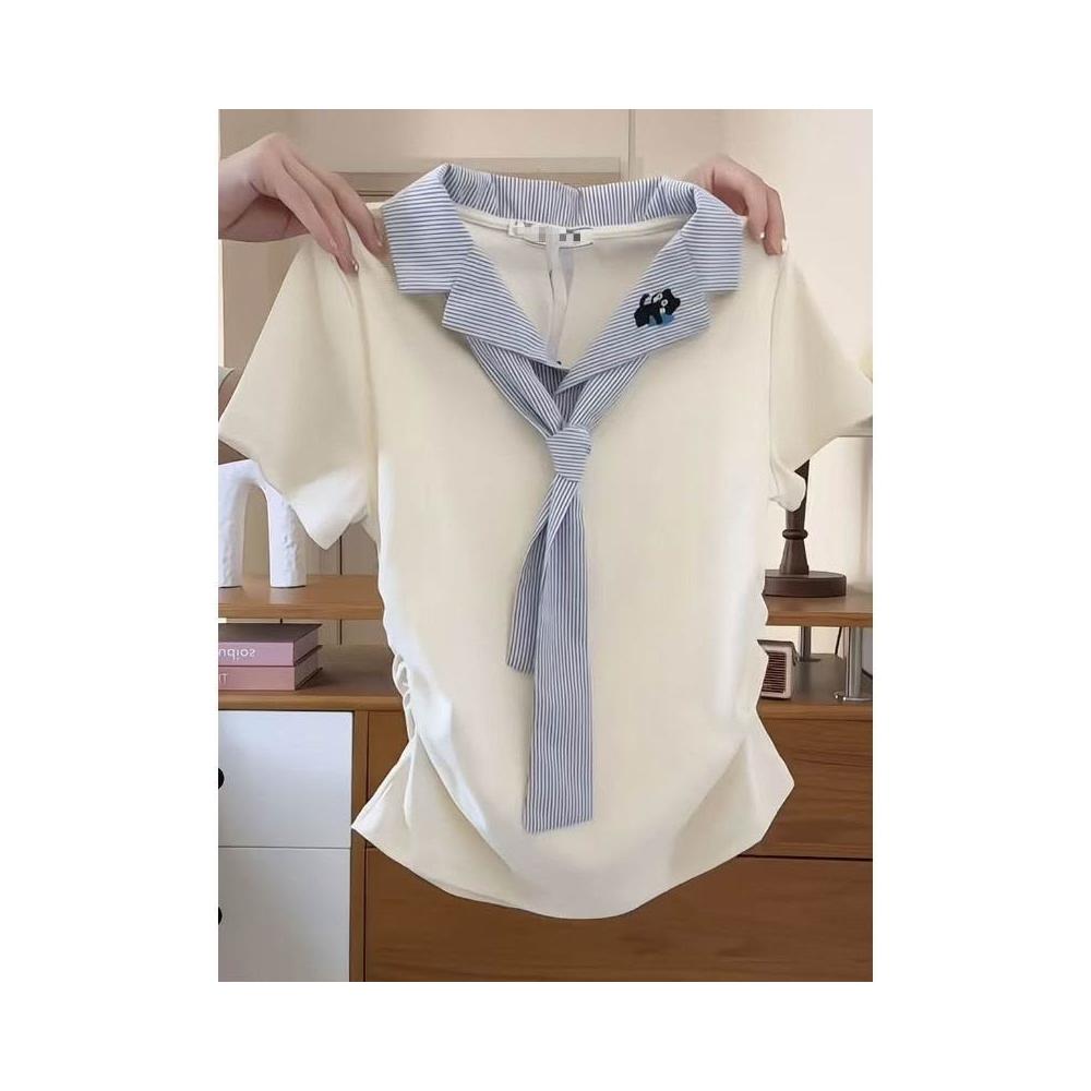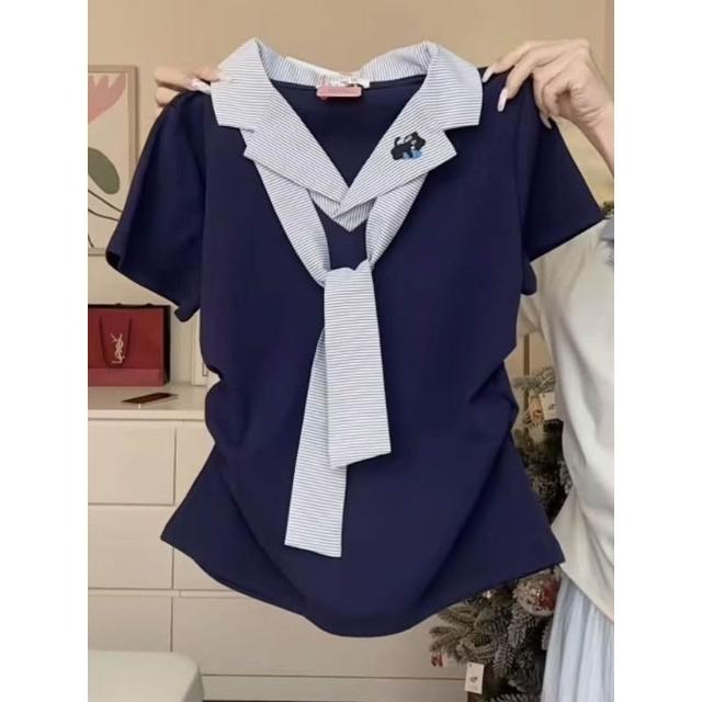 生活首選貓咪刺繡短款短袖女裝夏季拼色顯瘦條紋新款領帶poloT恤修身上衣