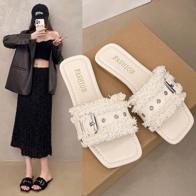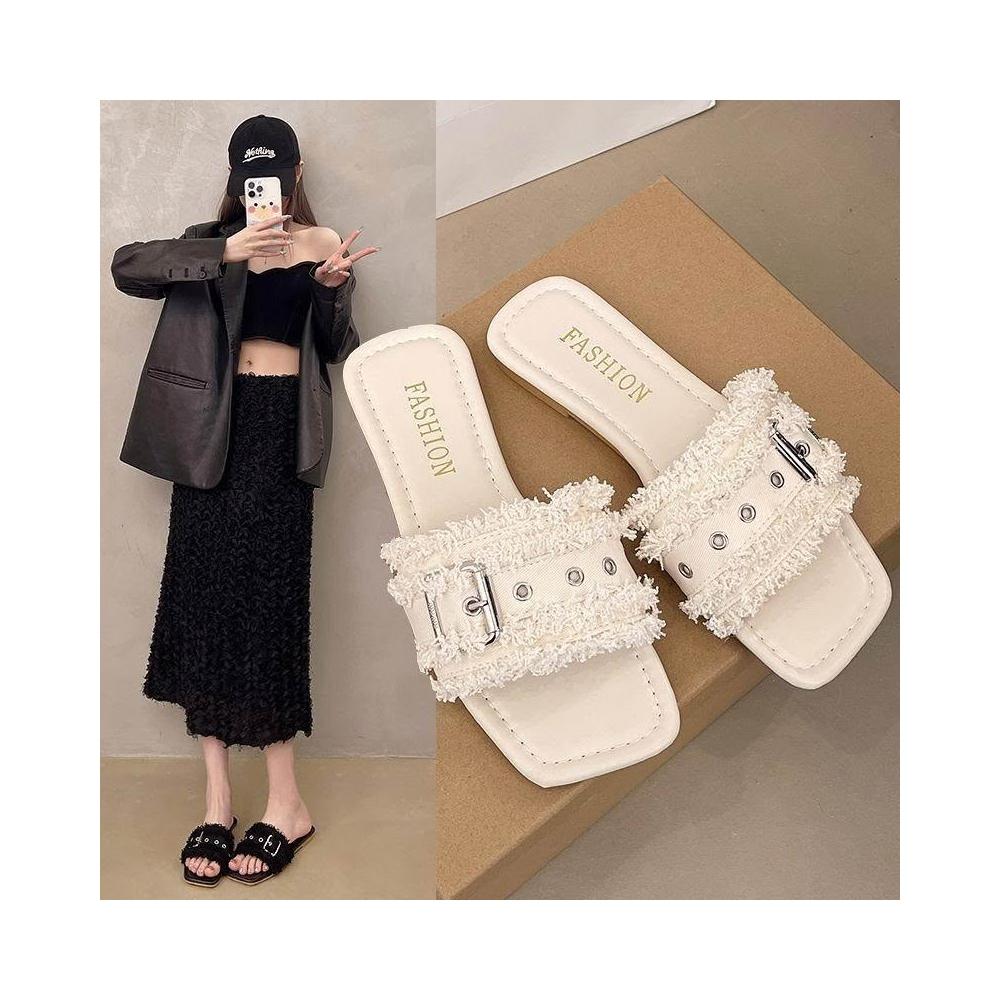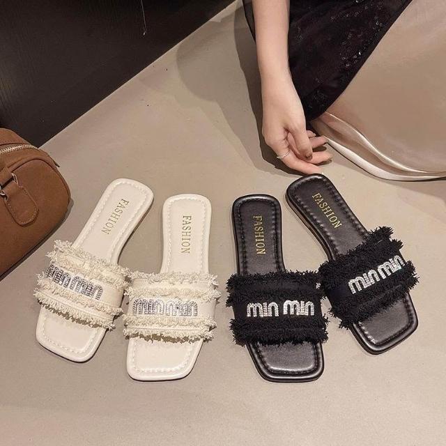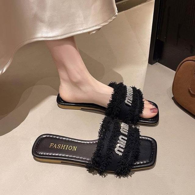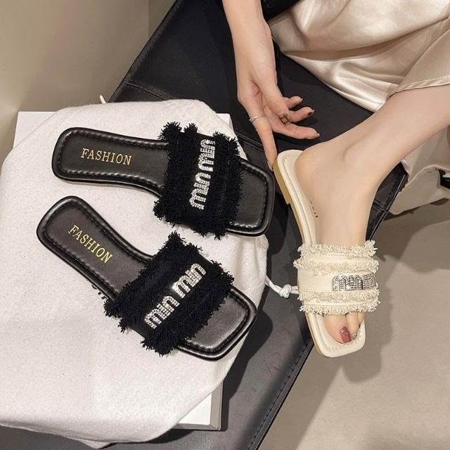 生活首選品牌真皮平底小香風拖鞋女夏新款時尚百搭法式水鑽網紅防滑一字拖
