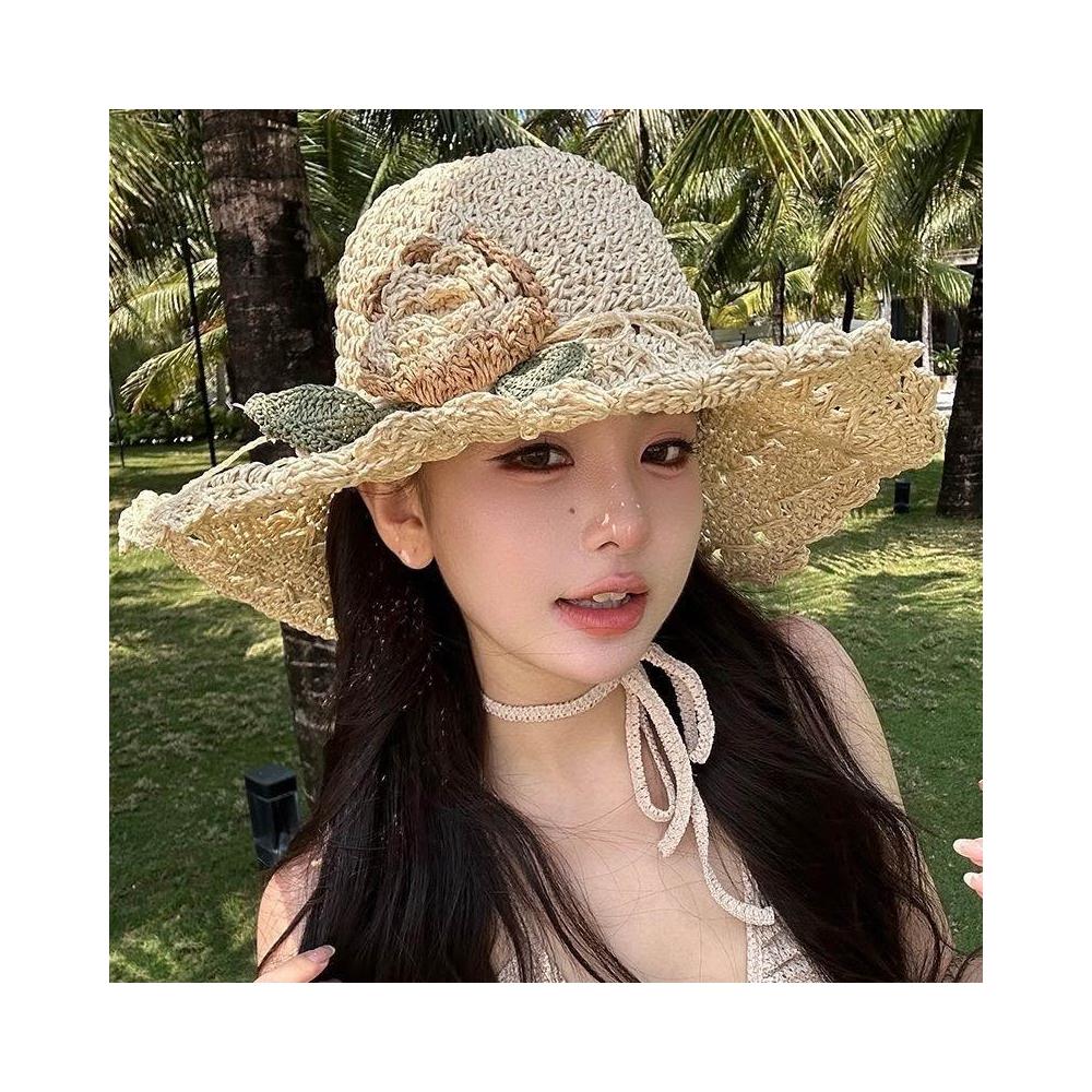 生活首選花朵手工編織草帽女可摺疊夏季海邊度假防曬帽大帽檐遮陽太陽帽子