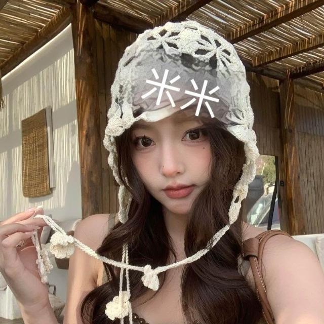 生活首選甜美可愛手工鉤花針織帽子女春秋季鏤空花朵堆堆帽流蘇薄款包頭帽