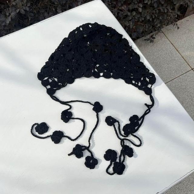 生活首選甜美可愛手工鉤花針織帽子女春秋季鏤空花朵堆堆帽流蘇薄款包頭帽