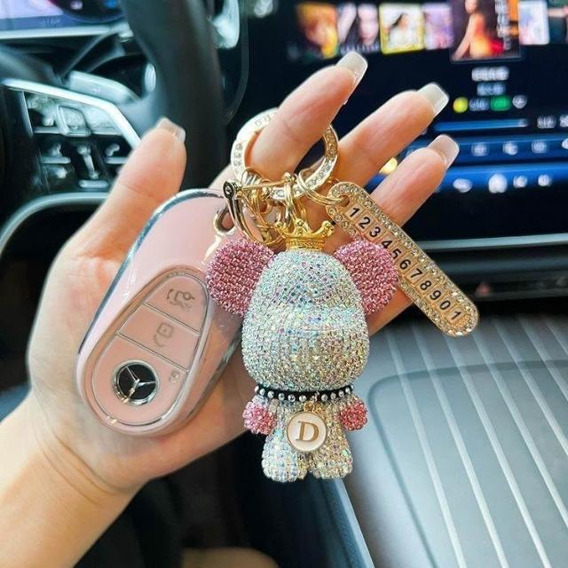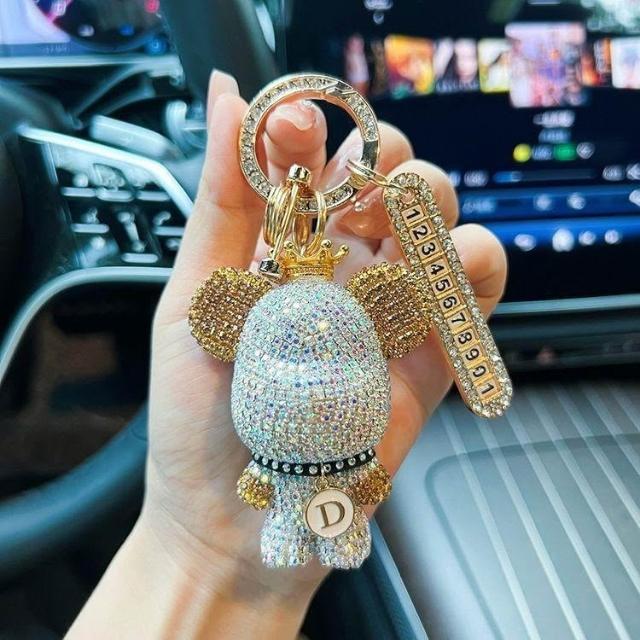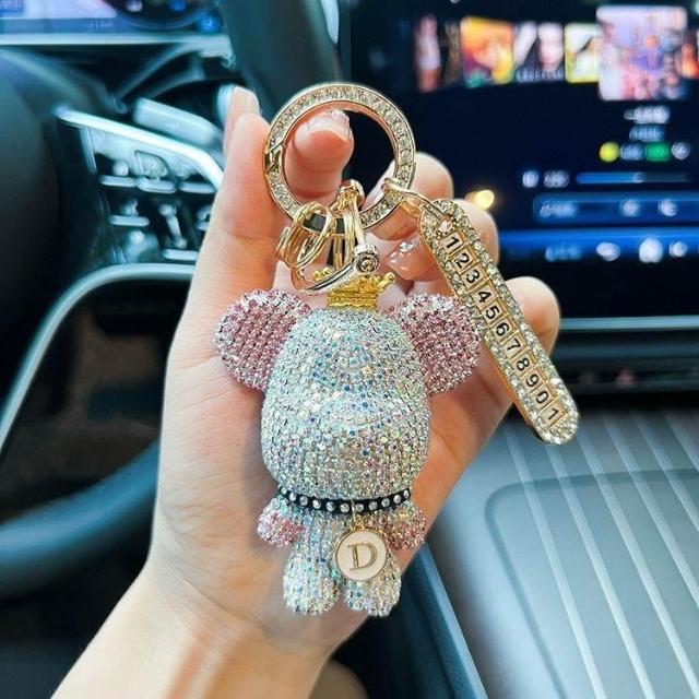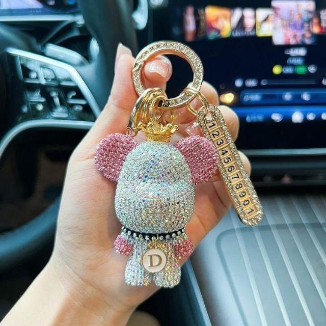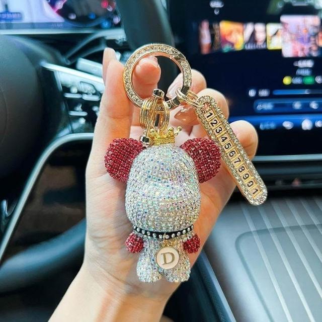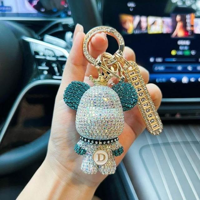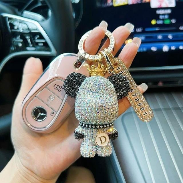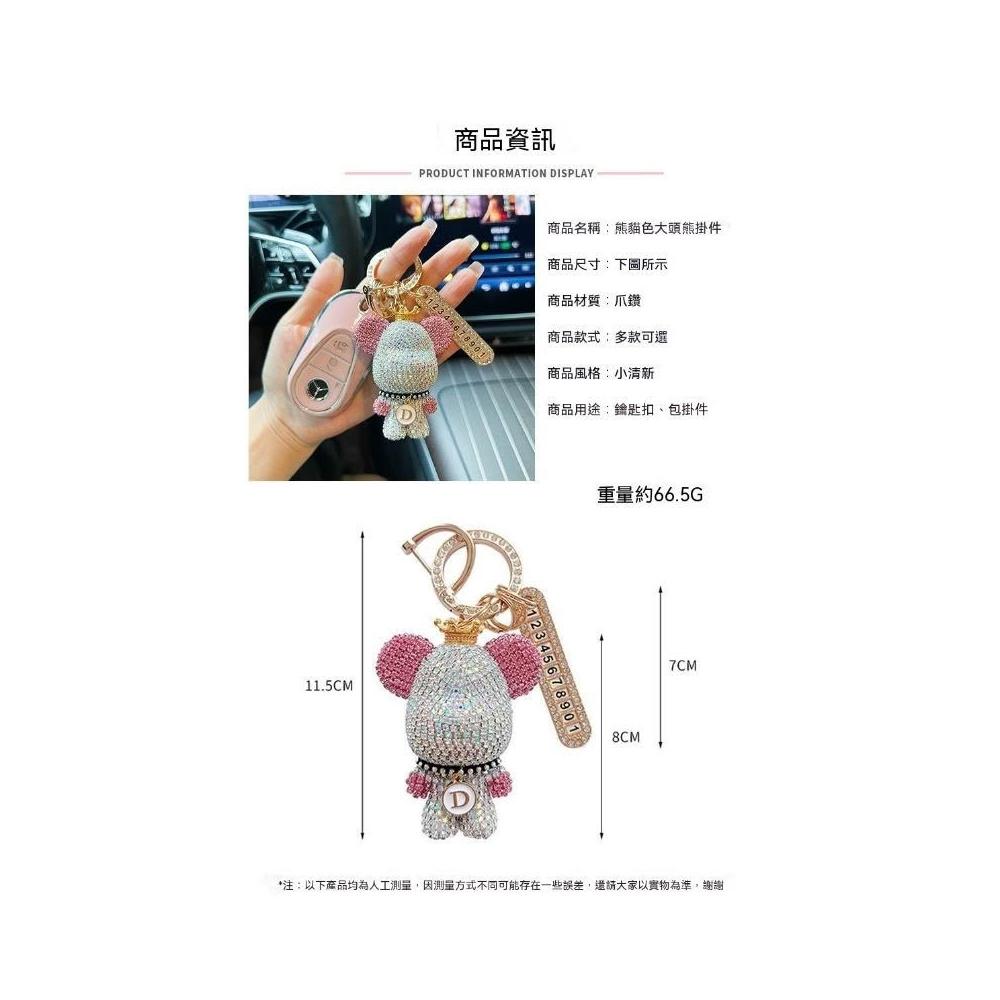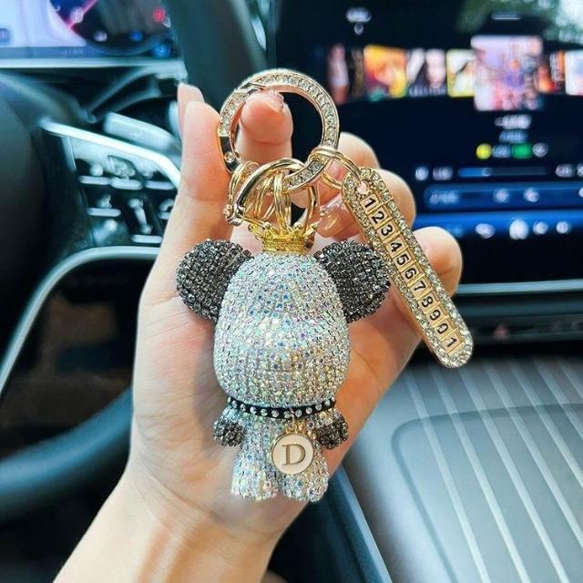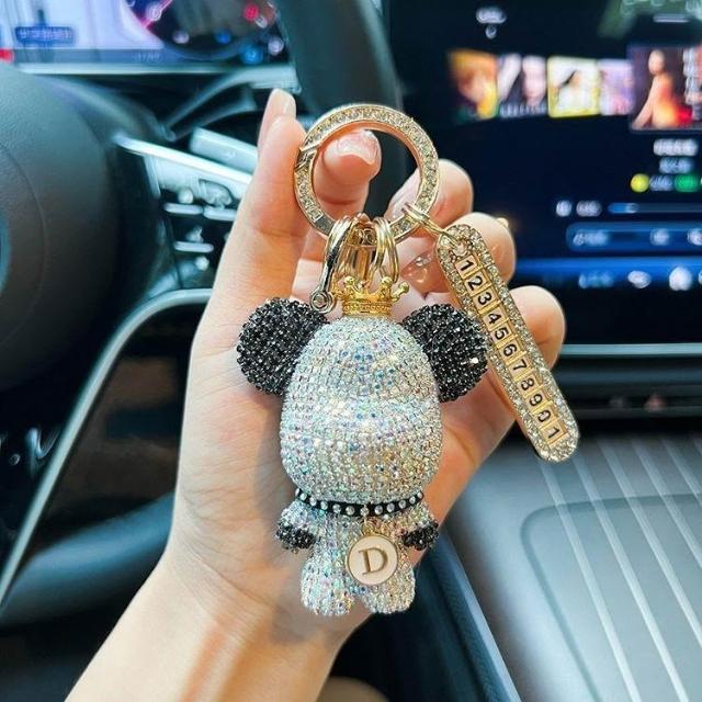 生活首選創意熊貓元素鑲鑽暴力熊鑰匙扣字母可選防丟號碼牌汽車鑰匙鏈禮物