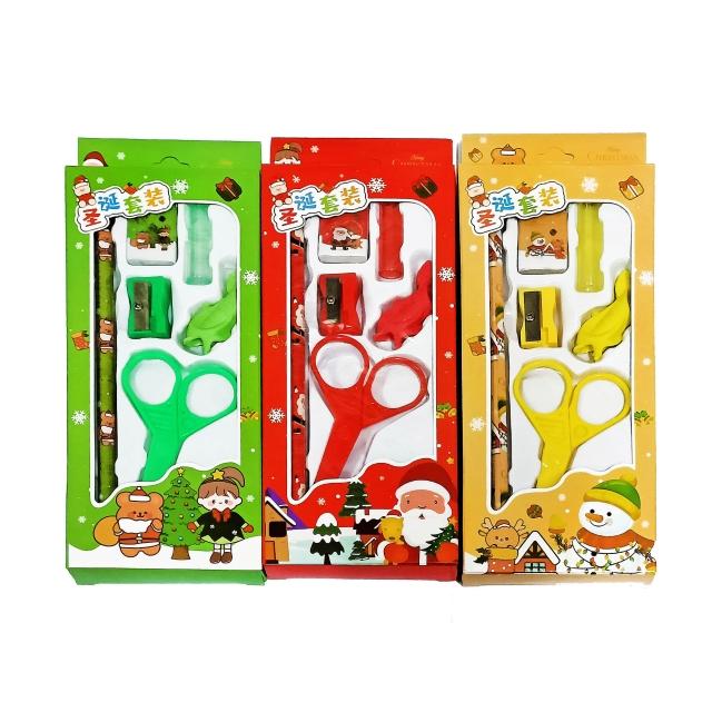 聖誕文具 聖誕文具組 三色 6件套裝 鉛筆/筆削/橡皮擦/握筆器/剪刀/筆蓋 贈品 禮品 套裝文具組 文具組