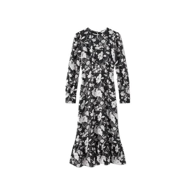 朱珠同款法式黑色山茶花印花連衣裙25夏桑蠶絲高級感搖曳魚擺長裙