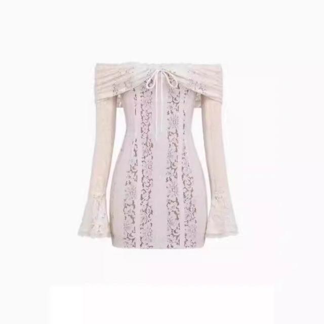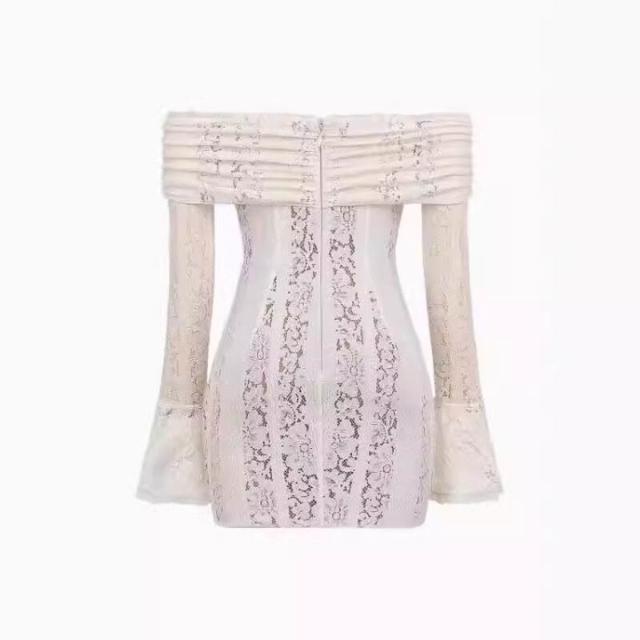 氣質白色一字肩長袖緊身蕾絲連衣裙收腰性感包臀裙