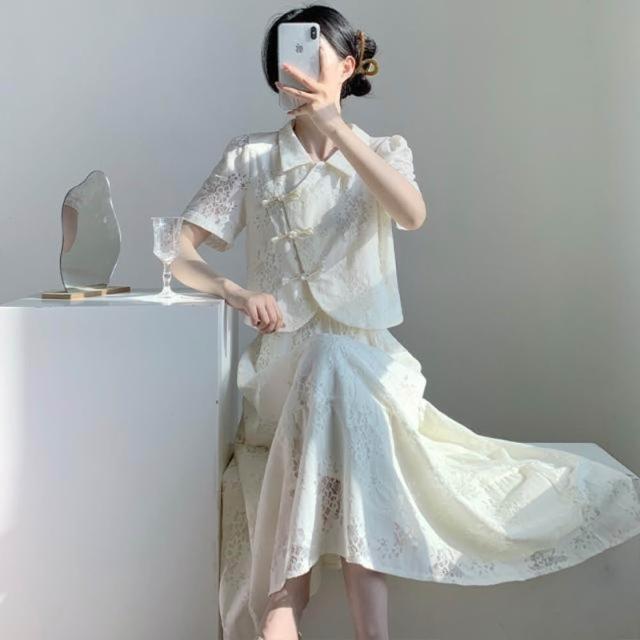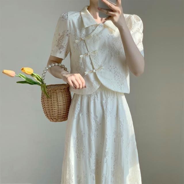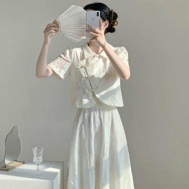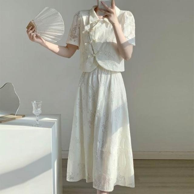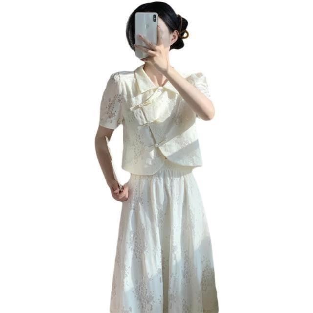 2025夏季新款新中式國風改良旗袍盤扣上衣配半身裙兩件套短袖蕾絲