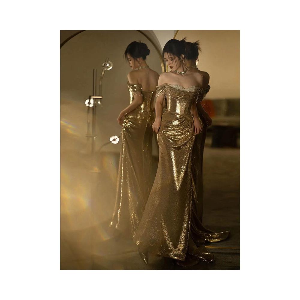 金色晚禮服女高級感亮片主持人一字肩抹胸敬酒服新娘魚尾裙小拖尾