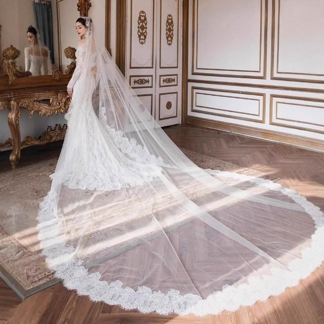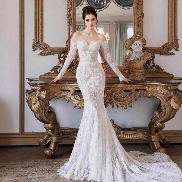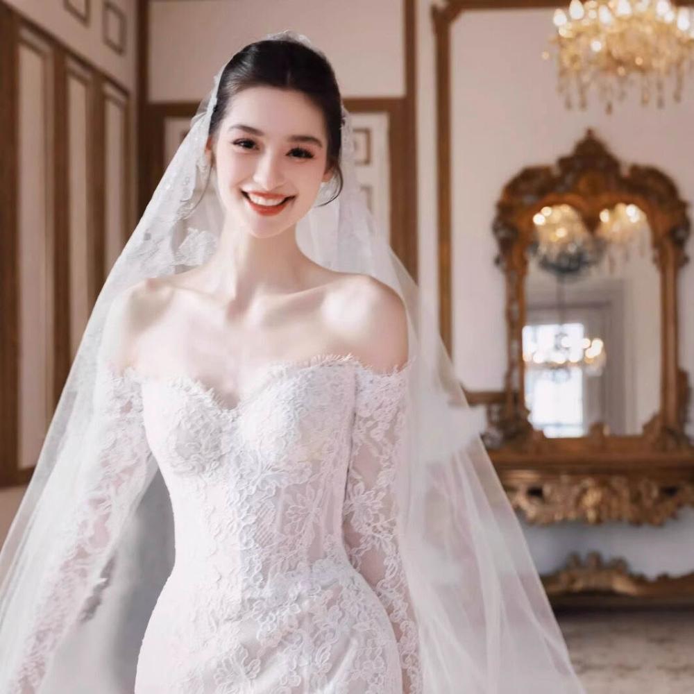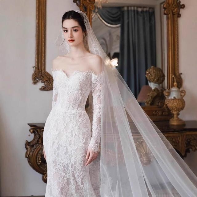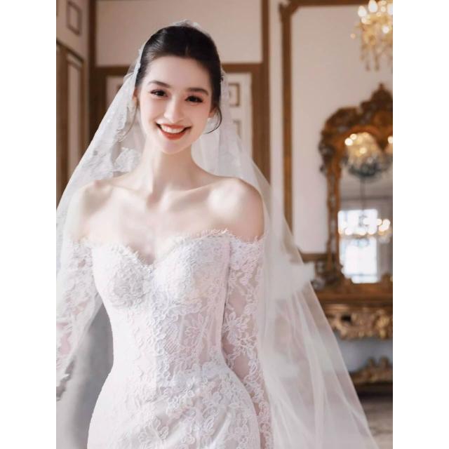 法式一字肩長袖蕾絲魚尾輕婚紗2025新款新娘小個子高端旅拍出門紗