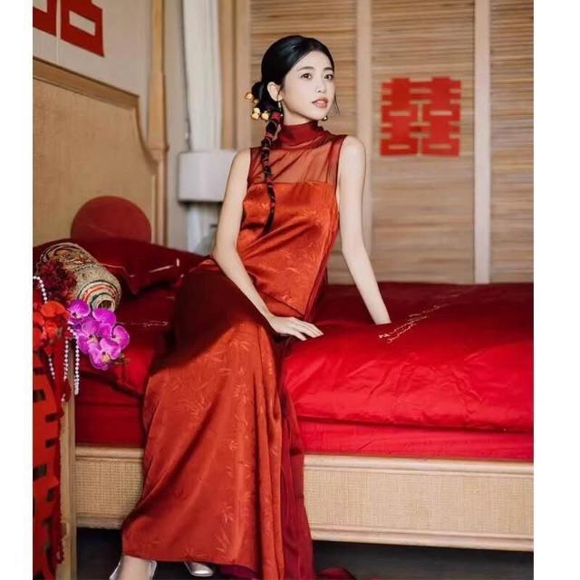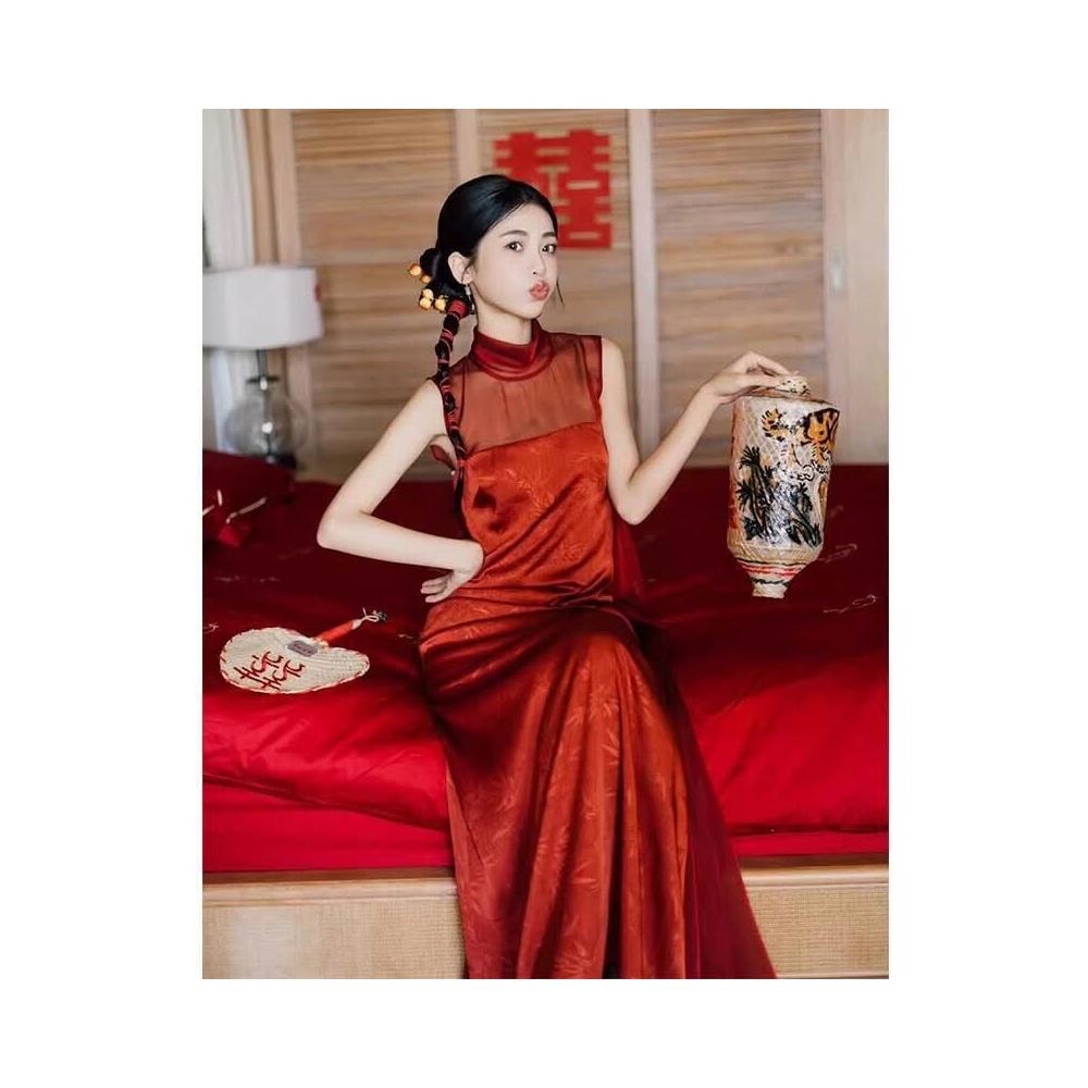新中式晨袍女新娘訂婚禮服高端國風改良無袖紅色旗袍敬酒服連衣裙