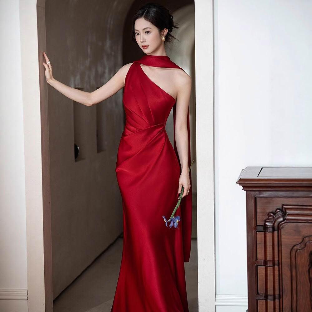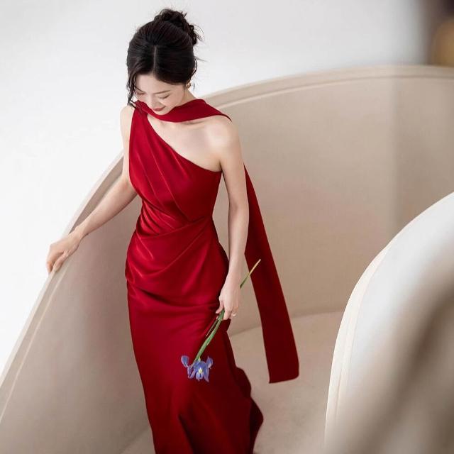紅色新品單肩訂婚禮服裙新中式高級感新娘晨袍輕奢小眾婚禮敬酒服