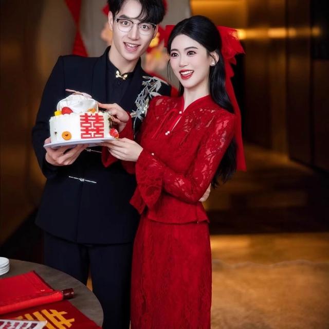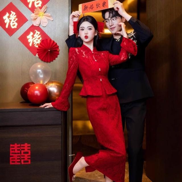 旗袍敬酒服新娘紅色訂婚禮服連衣裙新中式結婚衣服套裝長袖禮服女
