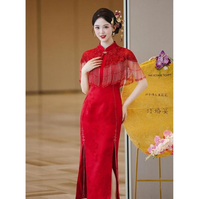 一字肩敬酒服新娘高級感新中式酒紅色結婚訂婚禮服女高端刺繡長裙