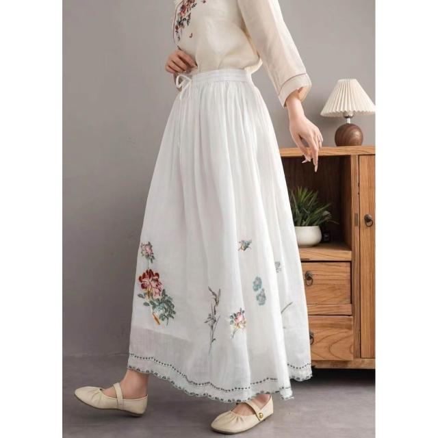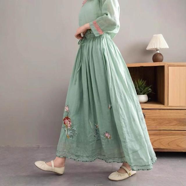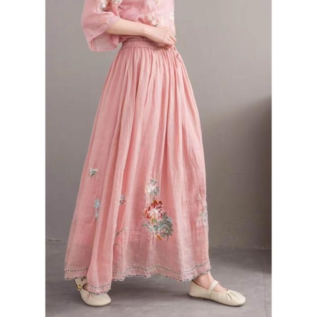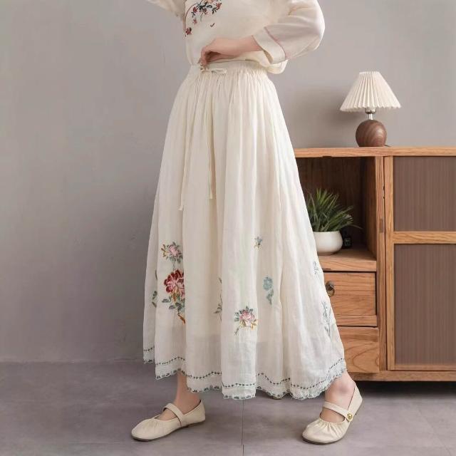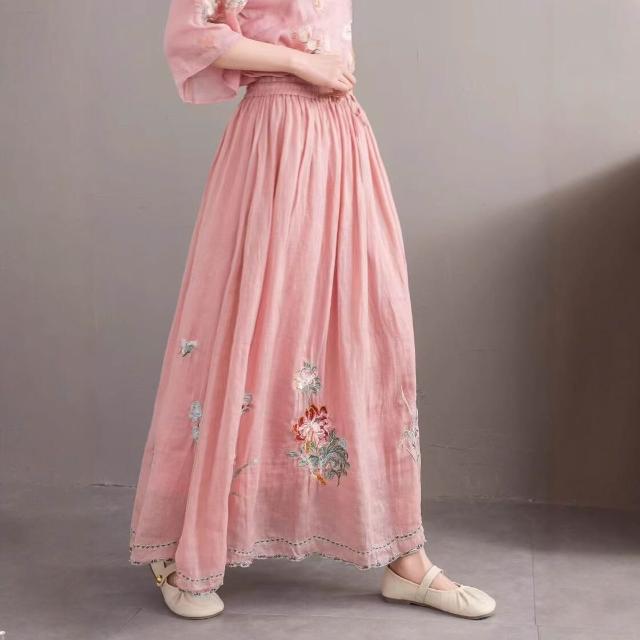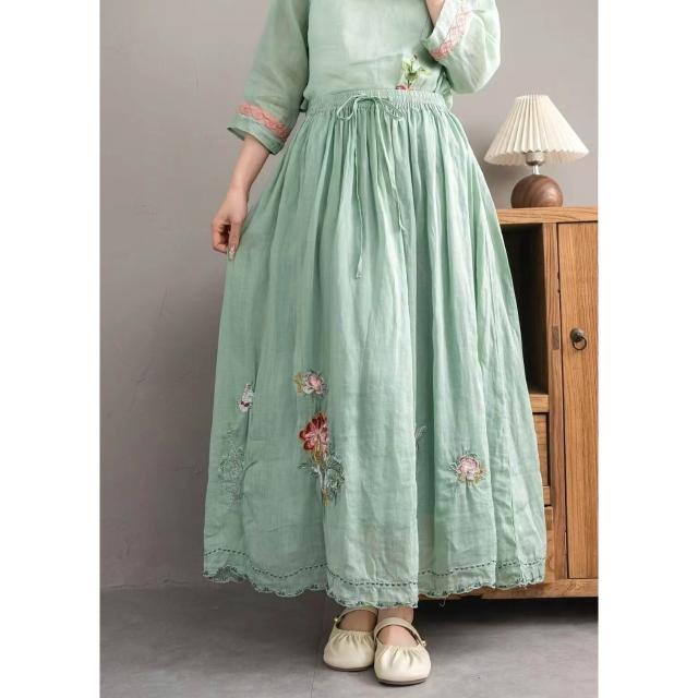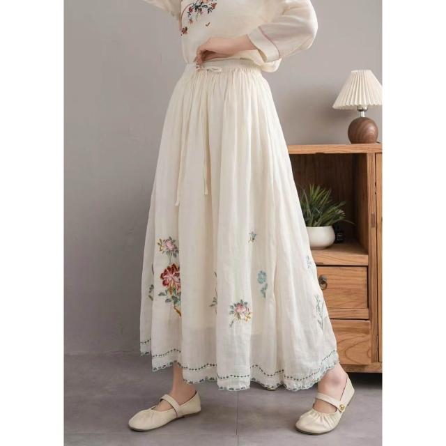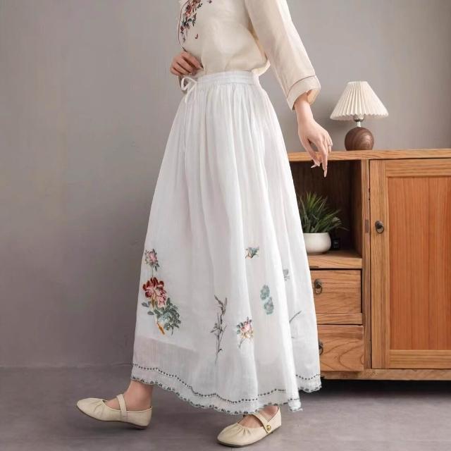 古咖服飾夏季新款苎麻刺繡雙層半身裙女松緊腰寬松氣質大擺裙