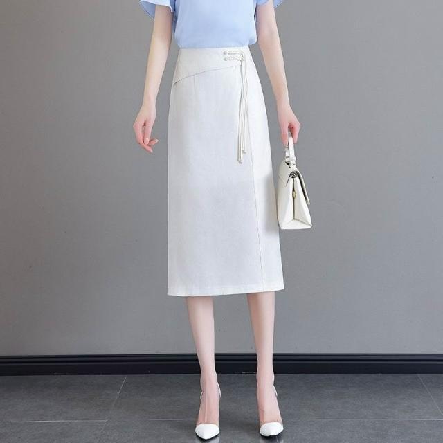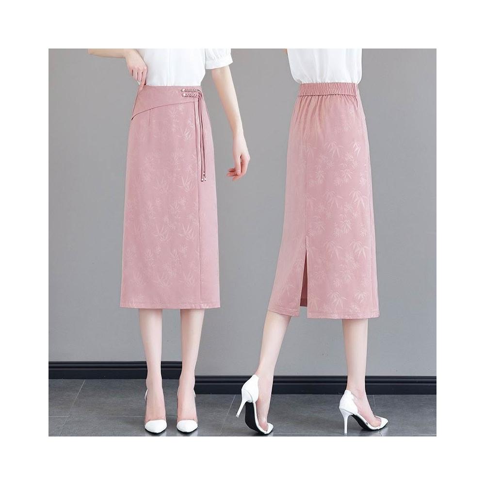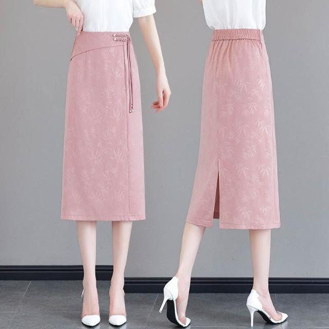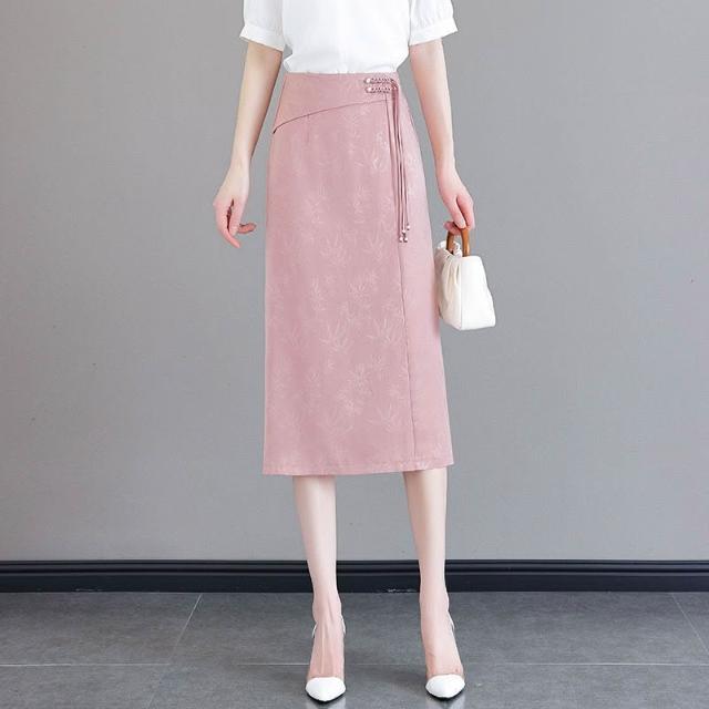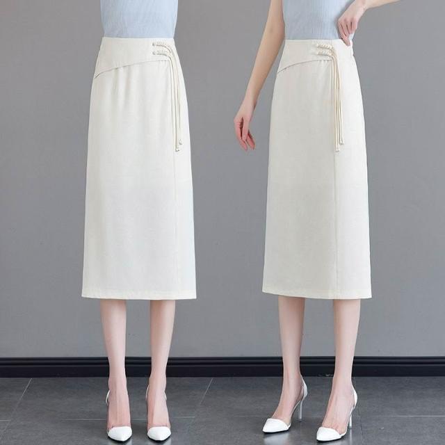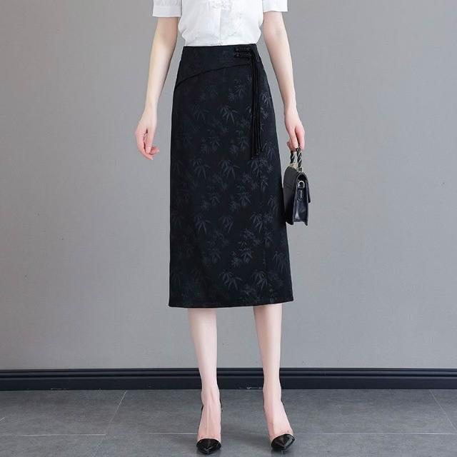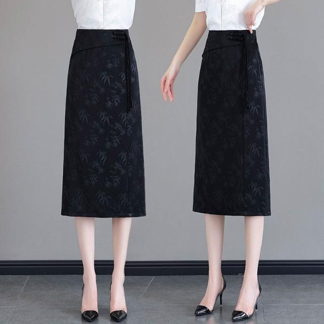 中式國風半身裙開叉春夏季2025新款高腰盤扣提花緞面一步直筒裙子