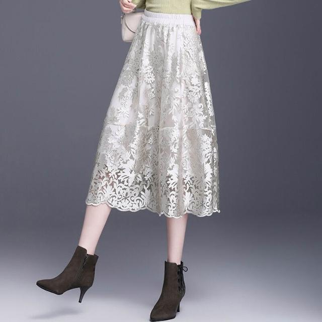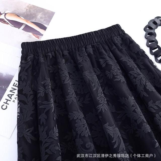 蕾絲高腰半身裙2025年新款時尚A字裙中長款女裝黑色鏡花苞裙