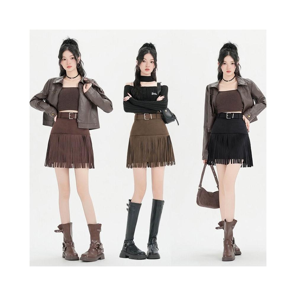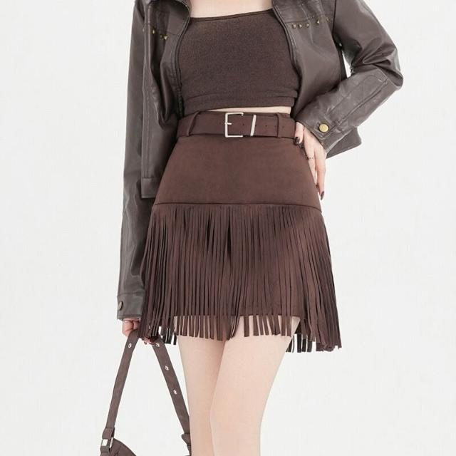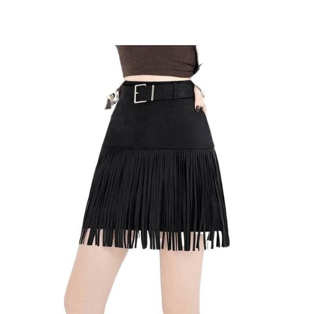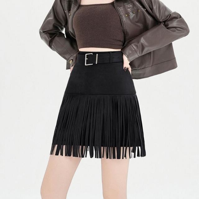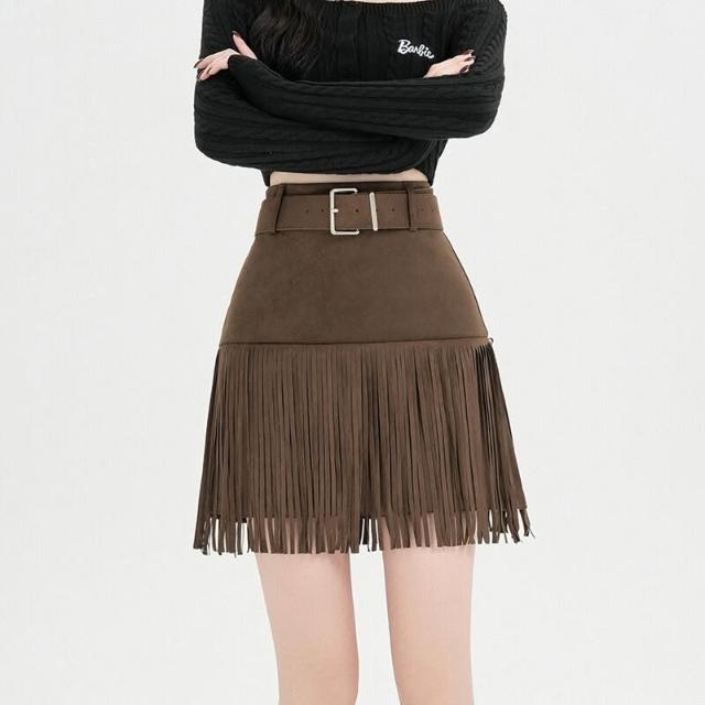 高腰顯瘦字麂皮絨流蘇半身裙包臀短裙女秋季半身裙