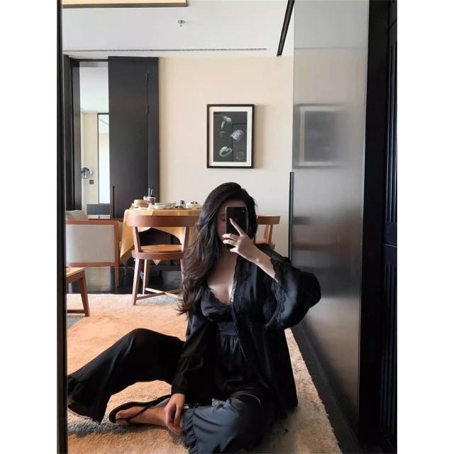 純欲風蕾絲邊V領冰絲睡衣女款春秋季2025年新款家居服大碼三件套