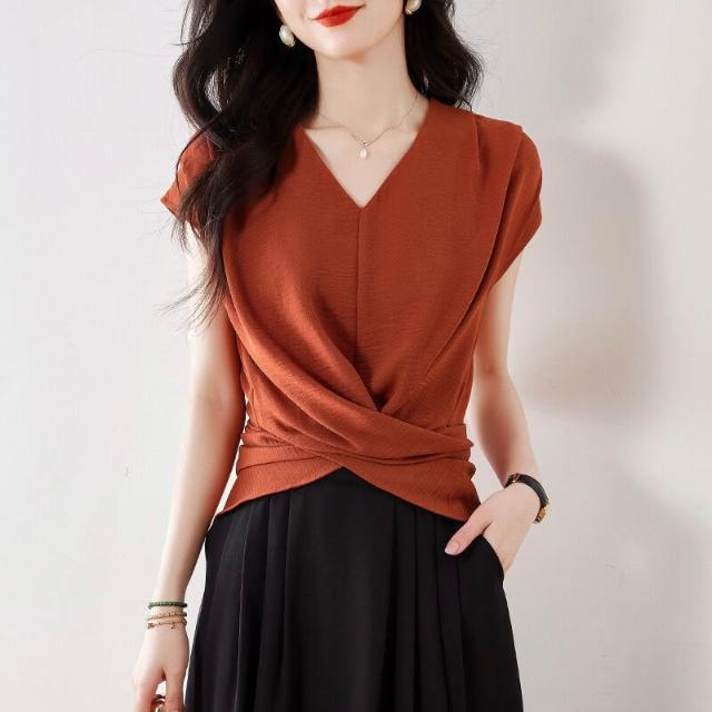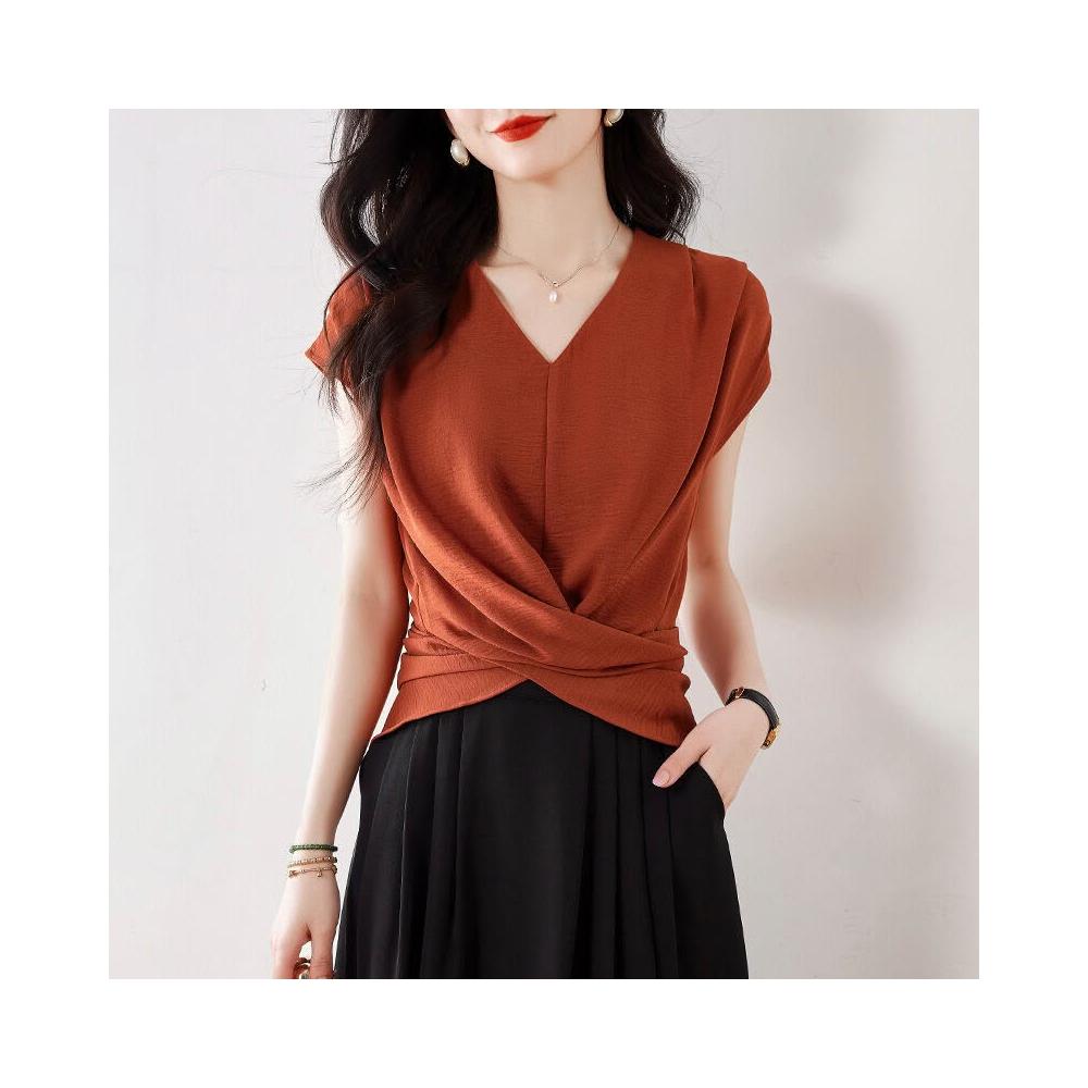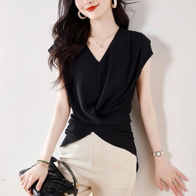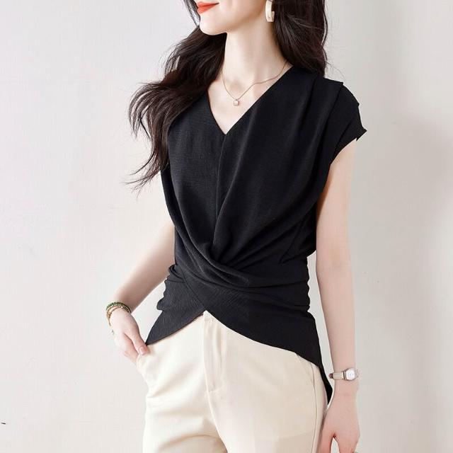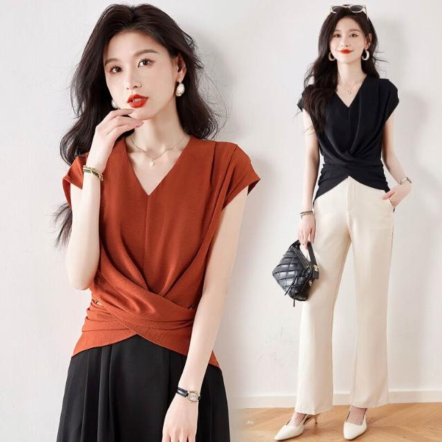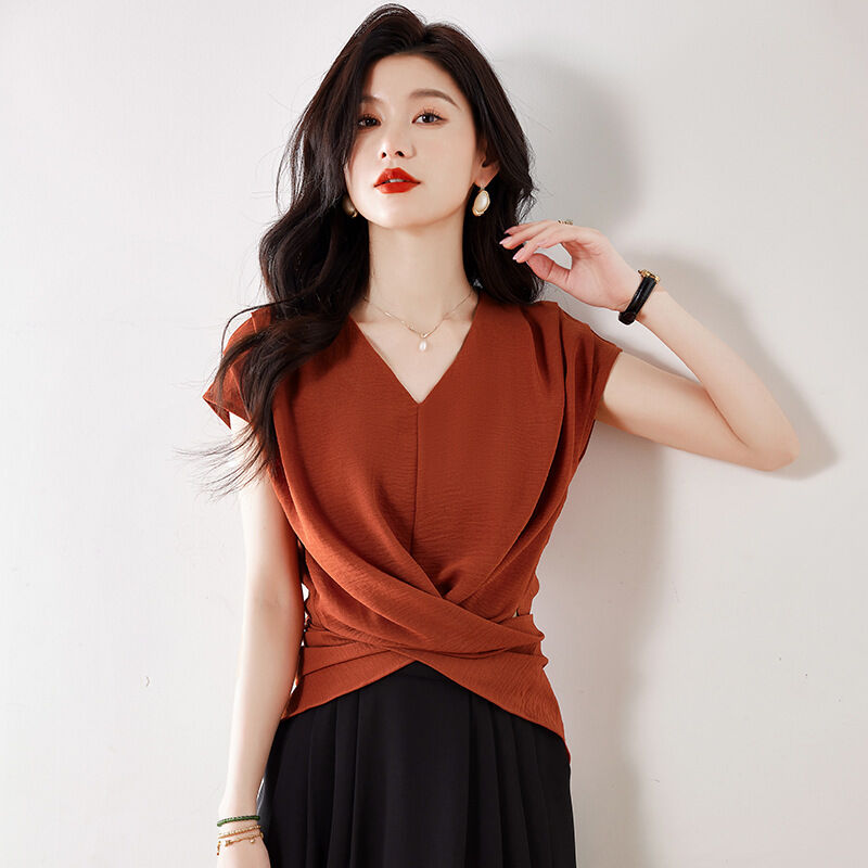 超火黑色v領短袖T恤女士2025夏季新款薄款輕奢高級感雪紡小衫上衣