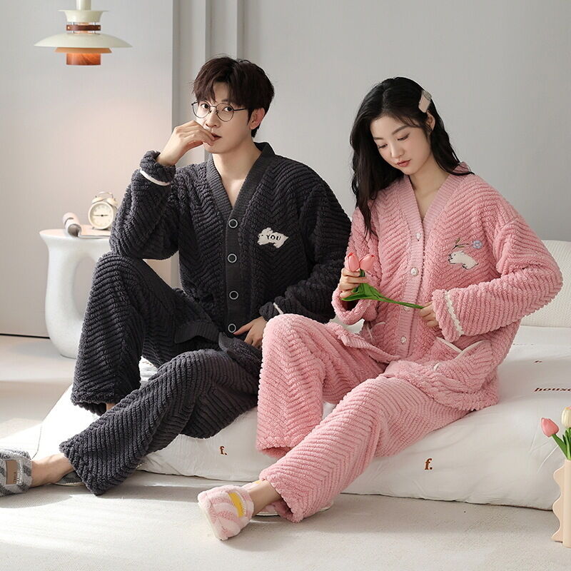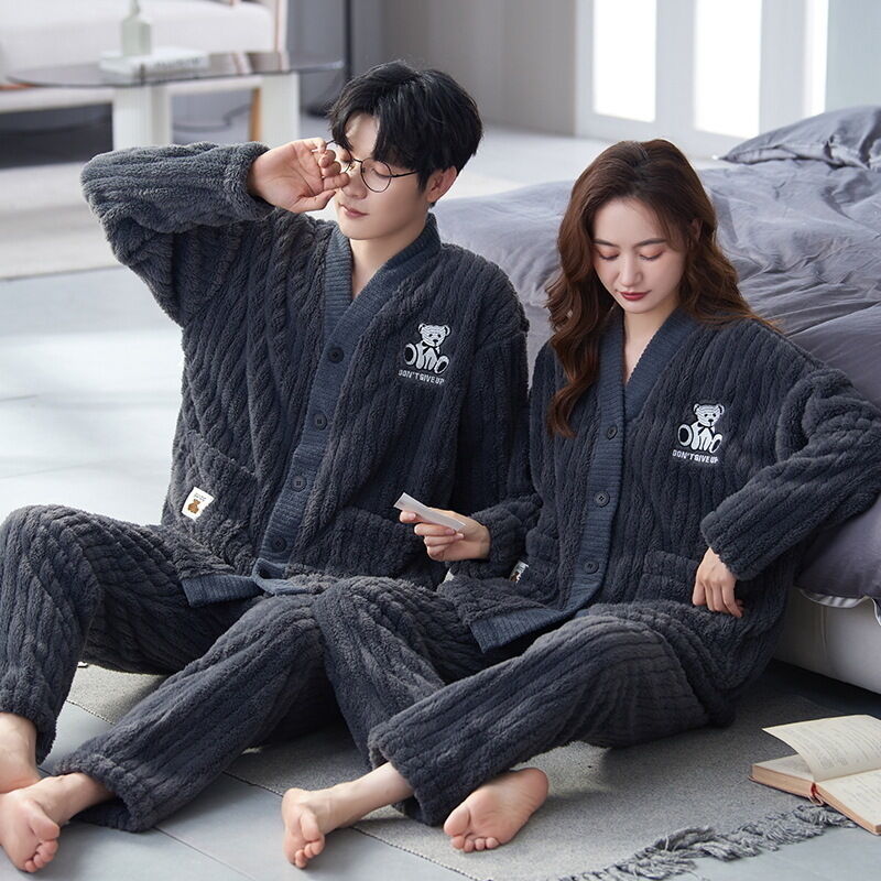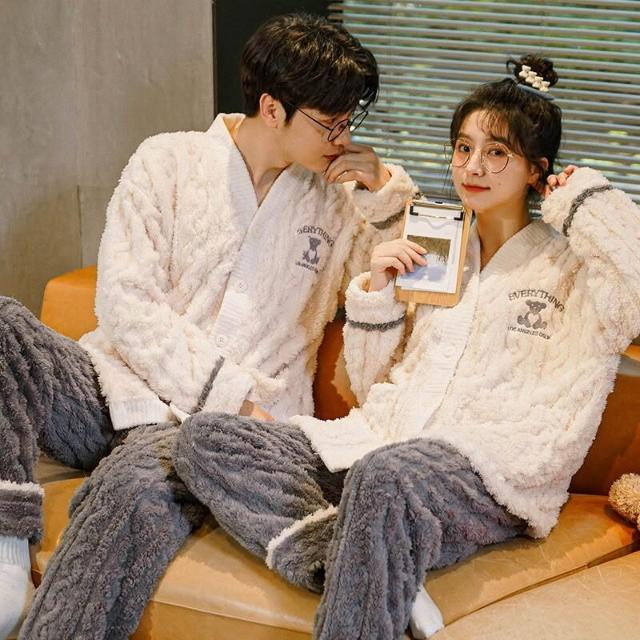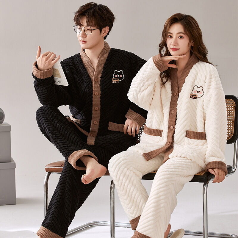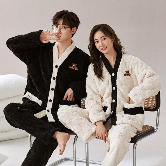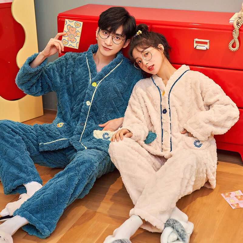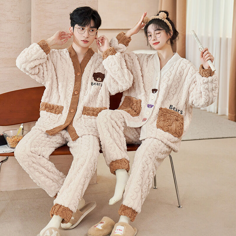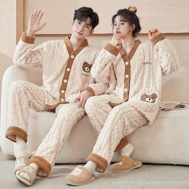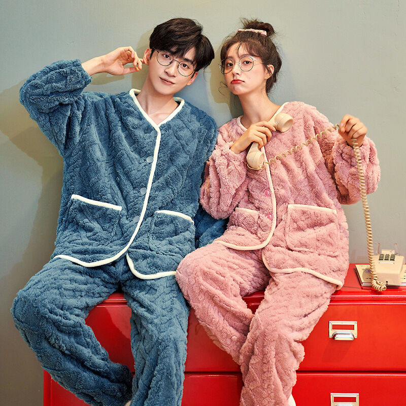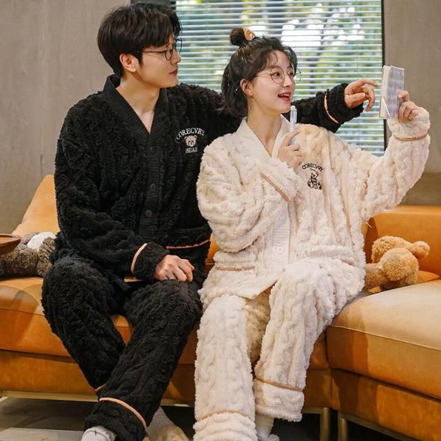 法蘭絨情侶睡衣女冬長袖套裝甜美可愛寬松男士加大碼珊瑚絨家居服