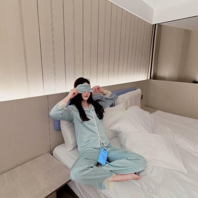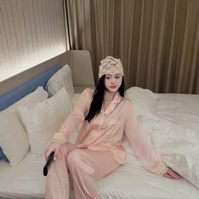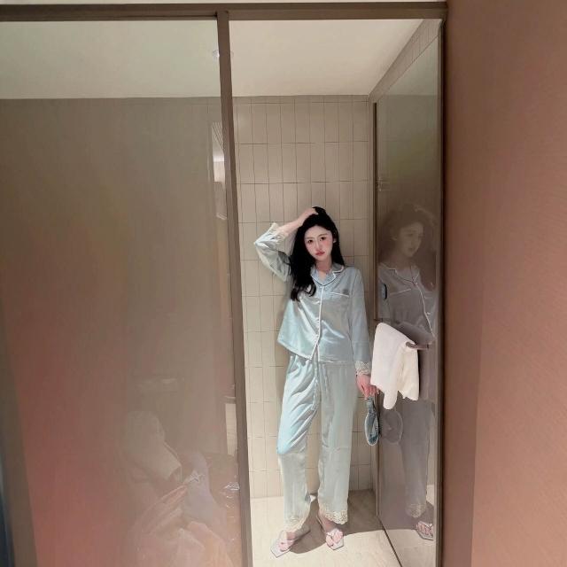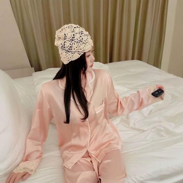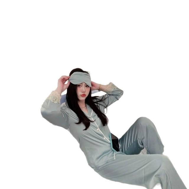 女士冰絲睡衣套裝夏季薄款家居服法式蕾絲花邊帶眼罩跨境一件代發