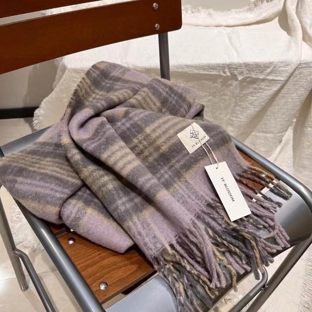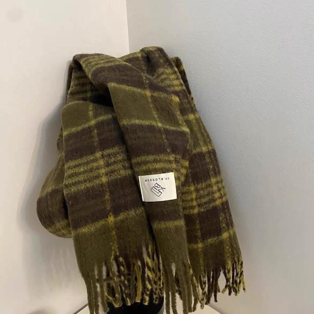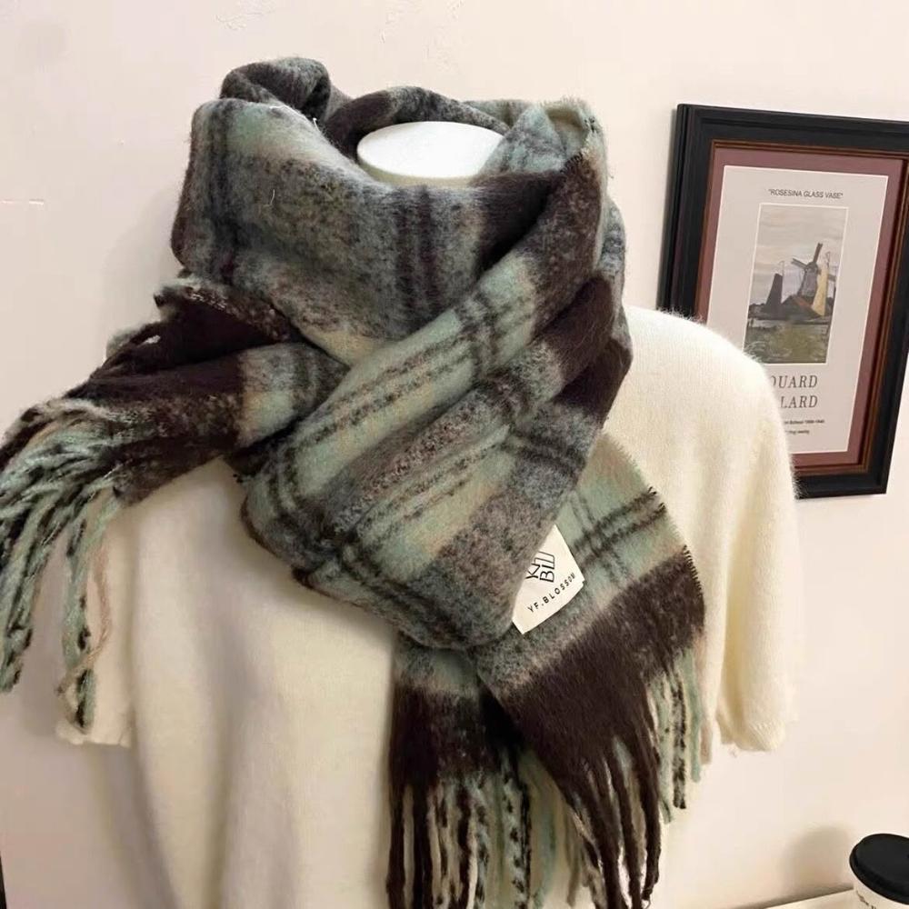 出口韓國原單英倫薄荷綠咖色格紋圍巾冬季新款馬海毛保暖圍脖披肩
