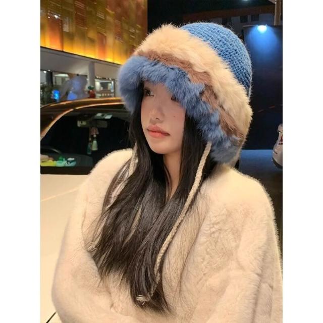 復古顯白藍色兔毛帽子女2024年冬季顯臉小毛絨漁夫帽保暖拼色盆帽