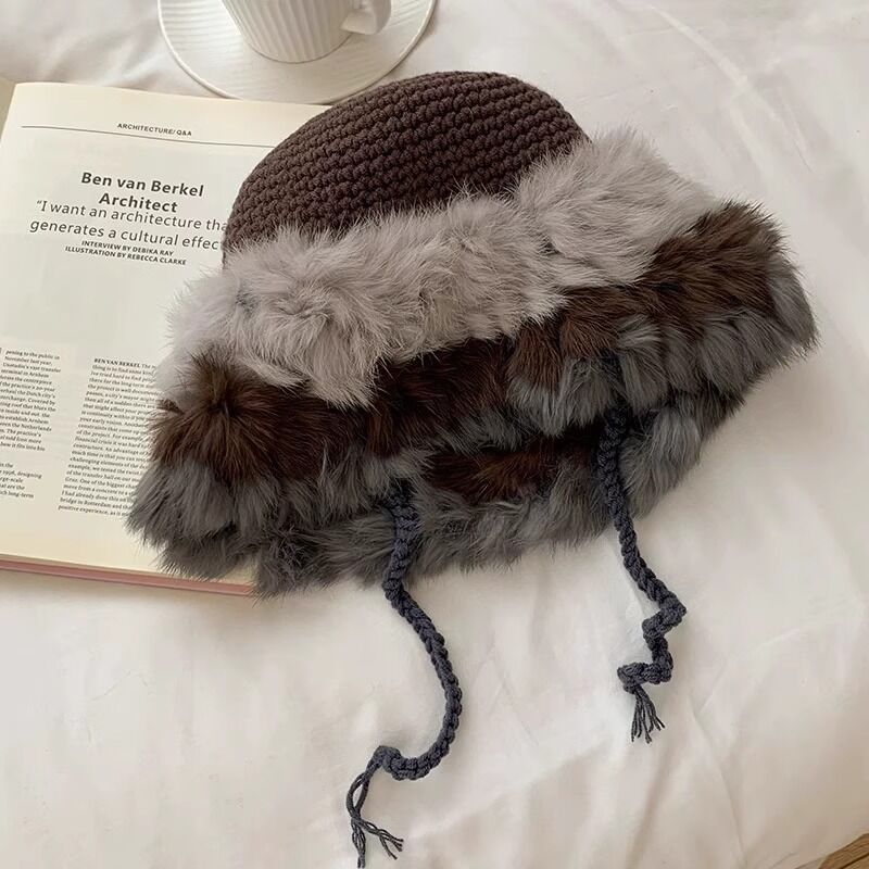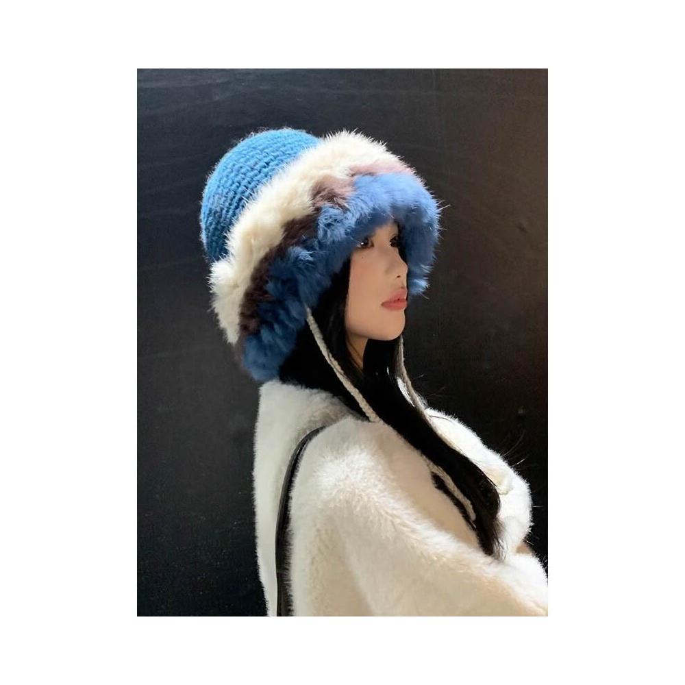 復古顯白藍色兔毛帽子女2024年冬季顯臉小毛絨漁夫帽保暖拼色盆帽