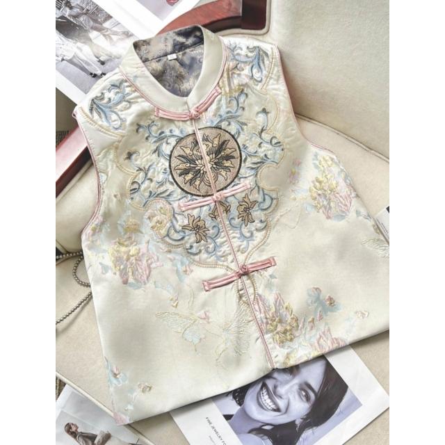 緞面新中式馬甲夾女加棉春秋季新款高端刺繡國風無袖上衣背心外套