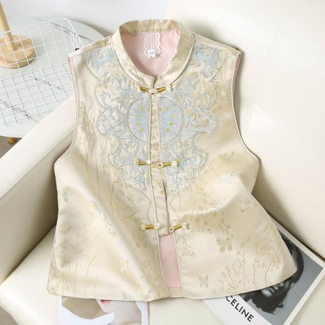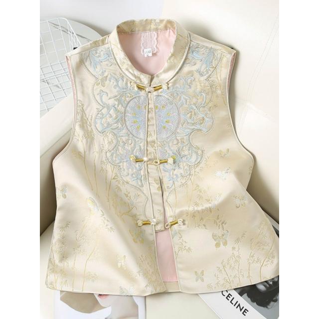 緞面新中式馬甲夾女加棉春秋季新款高端刺繡國風無袖上衣背心外套