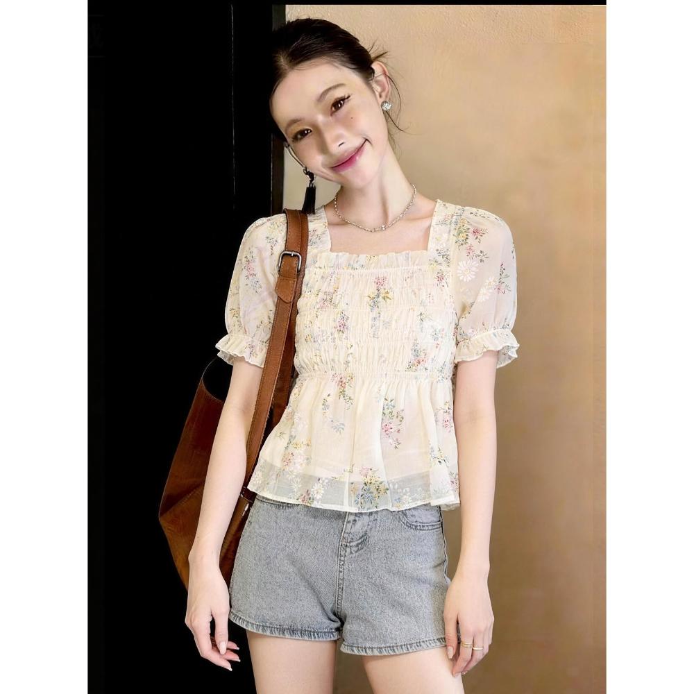 春夏上衣 短袖 2026修身顯瘦方領泡泡袖碎花雪紡衫夏季洋氣露背蝴蝶結短袖上衣 好夢想商鋪