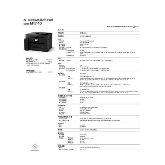 EPSONEPSON M15140 A 3黑白 高速 連續供墨 複合機 事務機 印表機 +T07M黑色墨水二瓶 另售 投影機