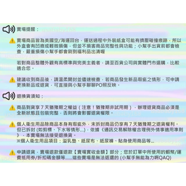- 個人衛生用品除商品本身有瑕疵外,未拆封商品仍享有十天猶豫期之退貨權利。但已拆封 (如剪標、下水等情形…),依據《通訊交易解除權合理例外情事適用準則》第二條規定,商店無法接受退換貨。
