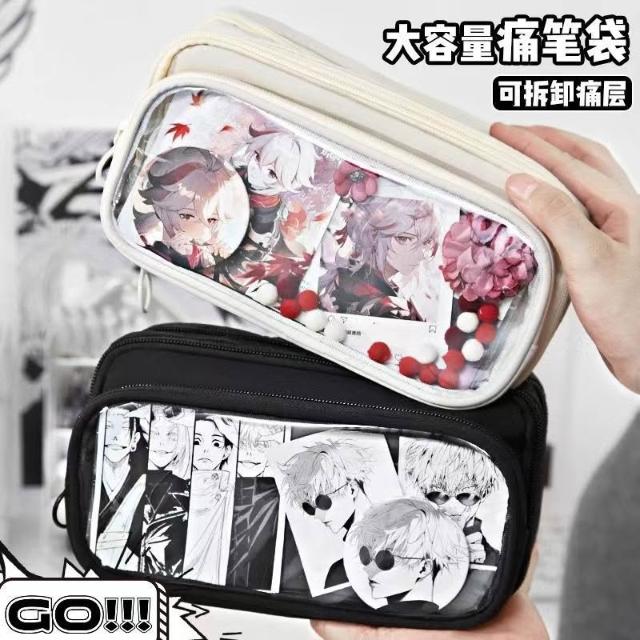 透明痛包pu防水筆袋大容量吧唧文具盒女孩國中生收納文具鉛筆盒可拆痛層 痛筆袋大容量透明二次元風吧唧痛包文具袋小食量diy