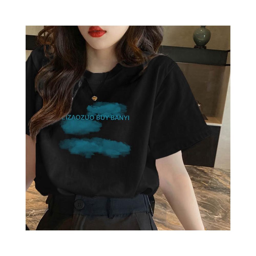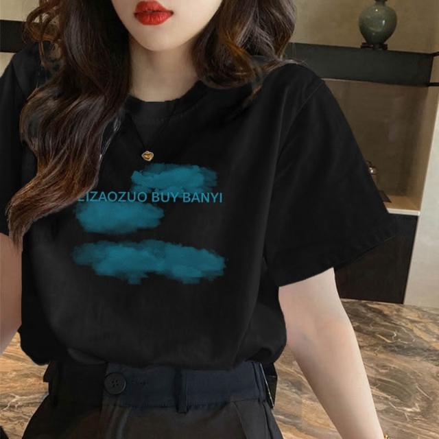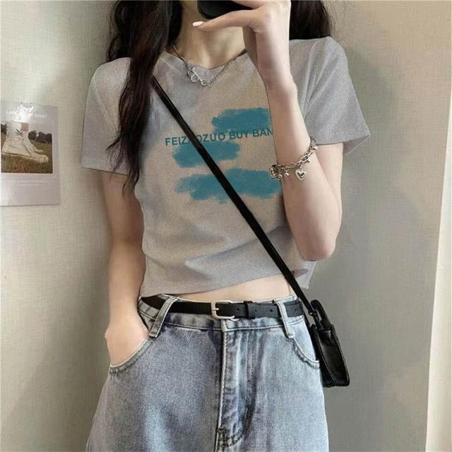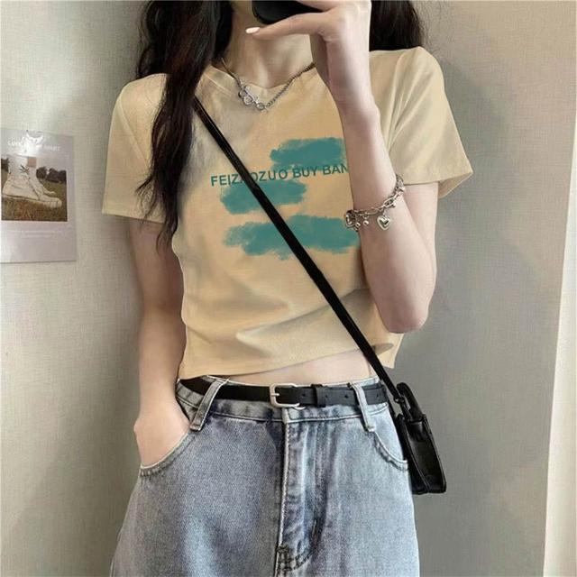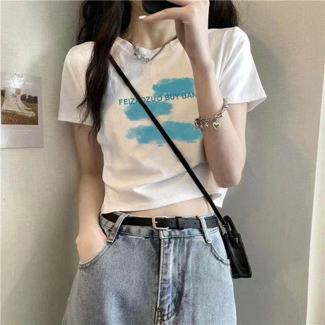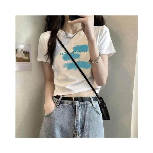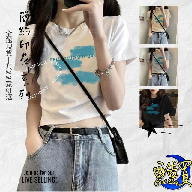『酷買』上衣 短袖 新款 修身基本款 印花白T t卹女 正肩 夏季 設計感 高腰 露臍 上衣