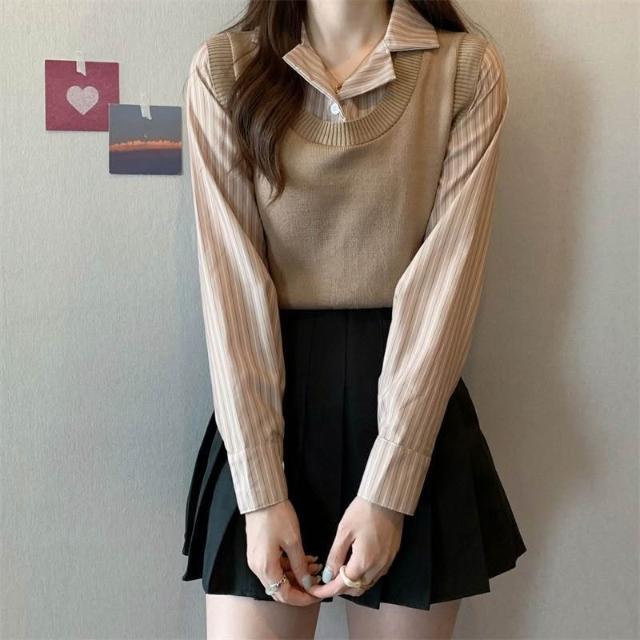 韓版長袖 復古學院風 假兩件 長袖上衣 針織上衣 毛衣 針織背心 女裝 衣服 寬鬆上衣 顯瘦上衣 冬裝