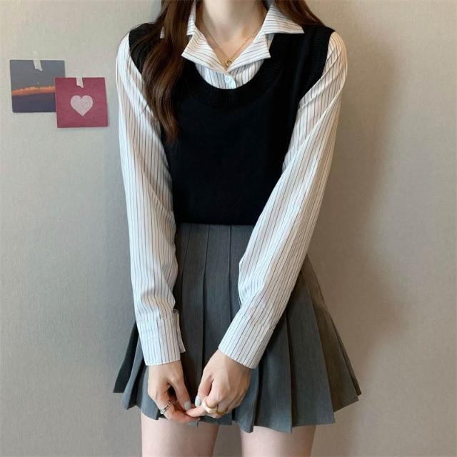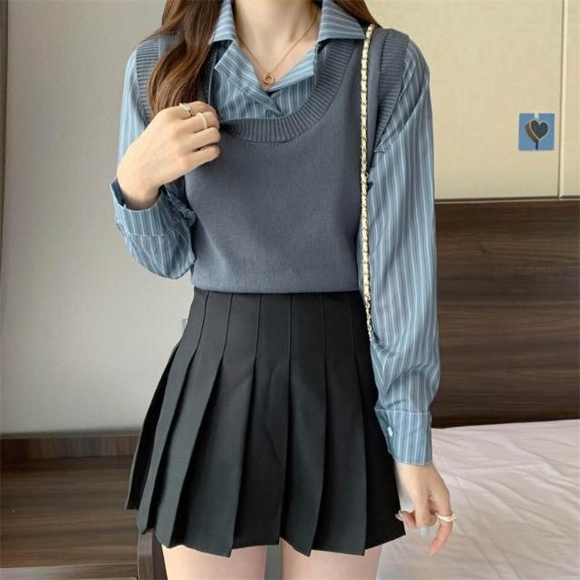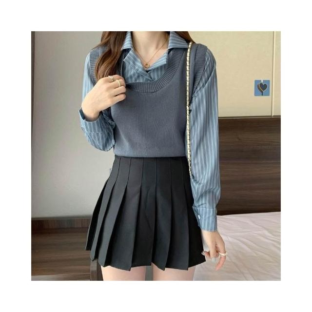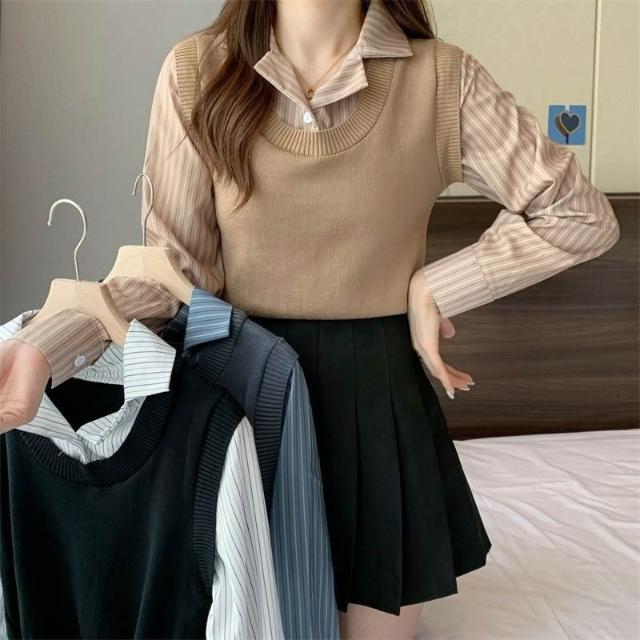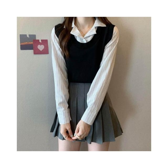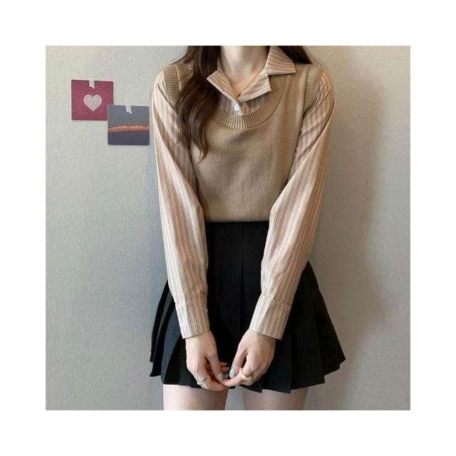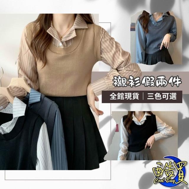 韓版長袖 復古學院風 假兩件 長袖上衣 針織上衣 毛衣 針織背心 女裝 衣服 寬鬆上衣 顯瘦上衣 冬裝