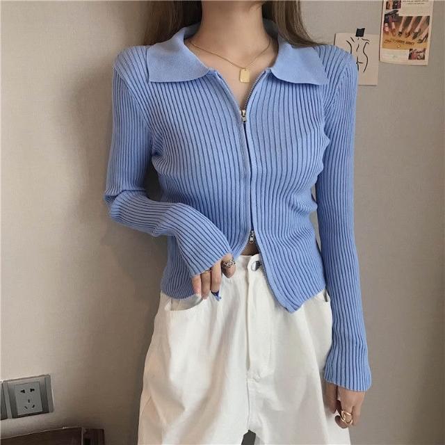 現貨🔥 韓版雙向拉鏈 女外套 針織 拉鏈開衫 翻領 收腰 彈性毛衣 針織衫 網紅 女團風 女長袖 春秋