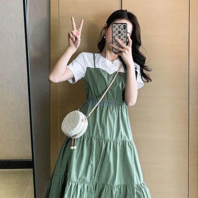韓系連衣裙 假兩件 連衣裙 日系 洋裝氣質 中長裙 短袖洋裝 收腰連身裙 學院風 女裝 女生衣服 裙子