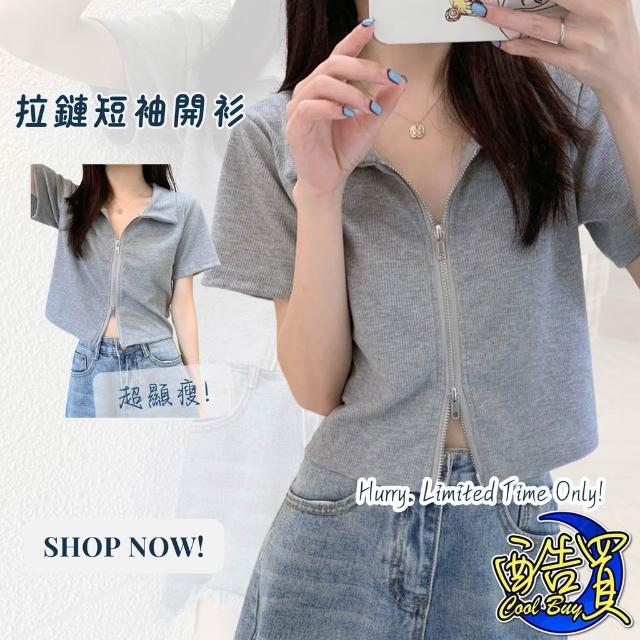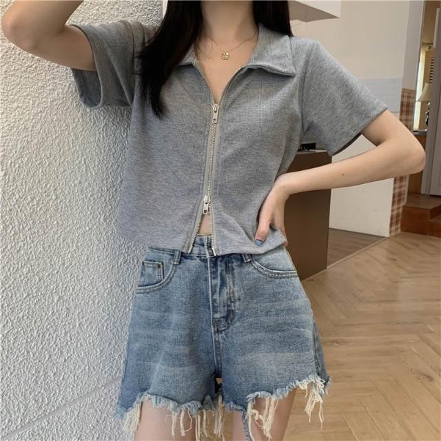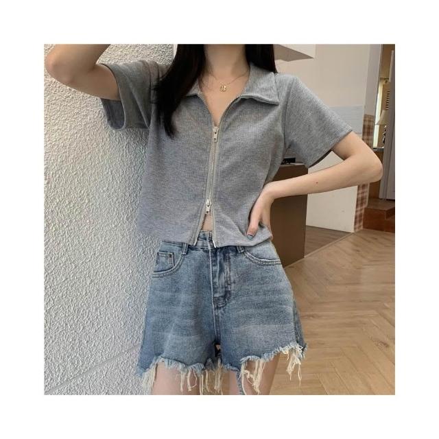 短版上衣 短款 t恤女 翻領 Polo衫 學生 拉鍊上衣 開襟衫 修身 高腰 露臍 短袖 上衣 設計感