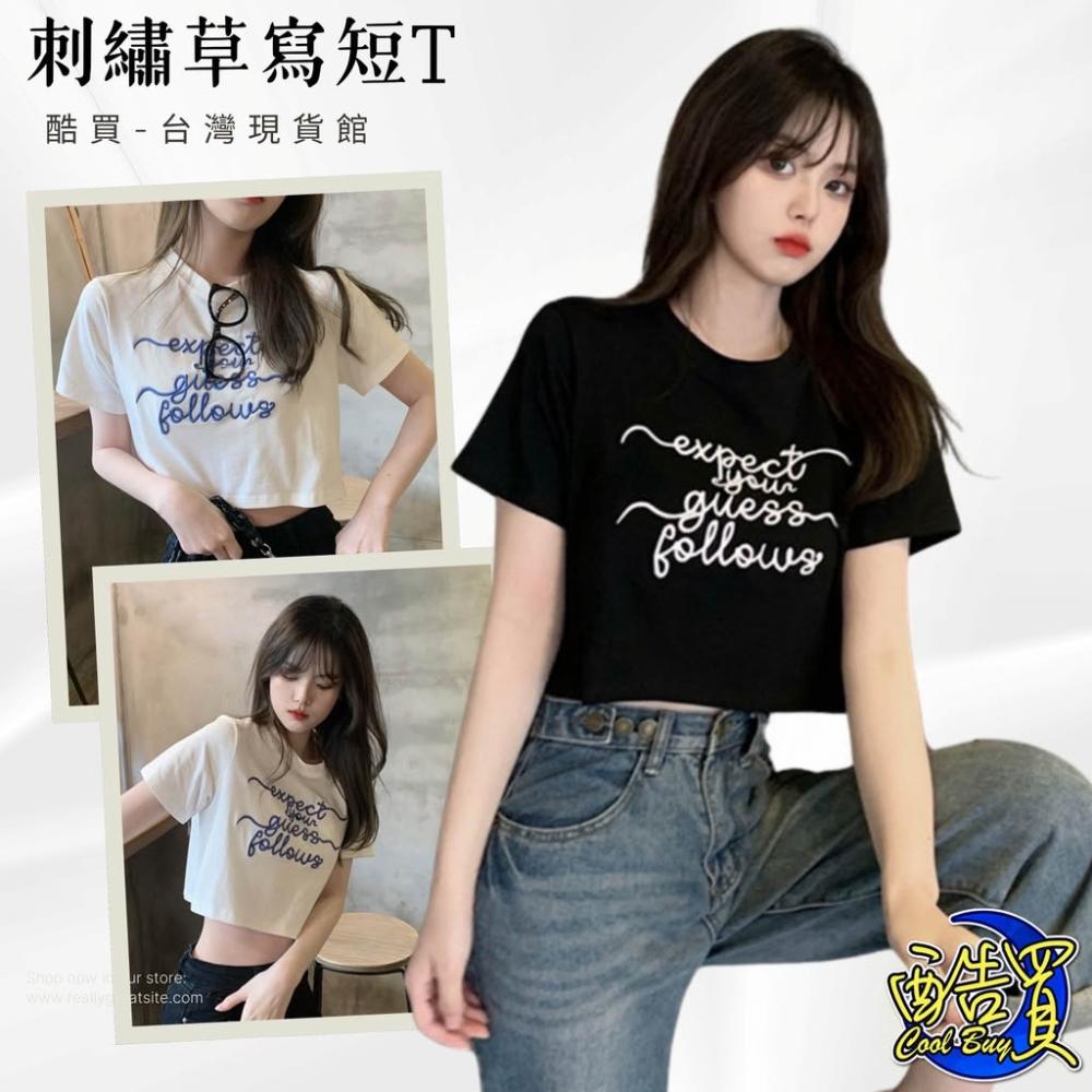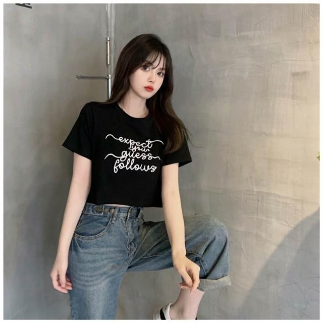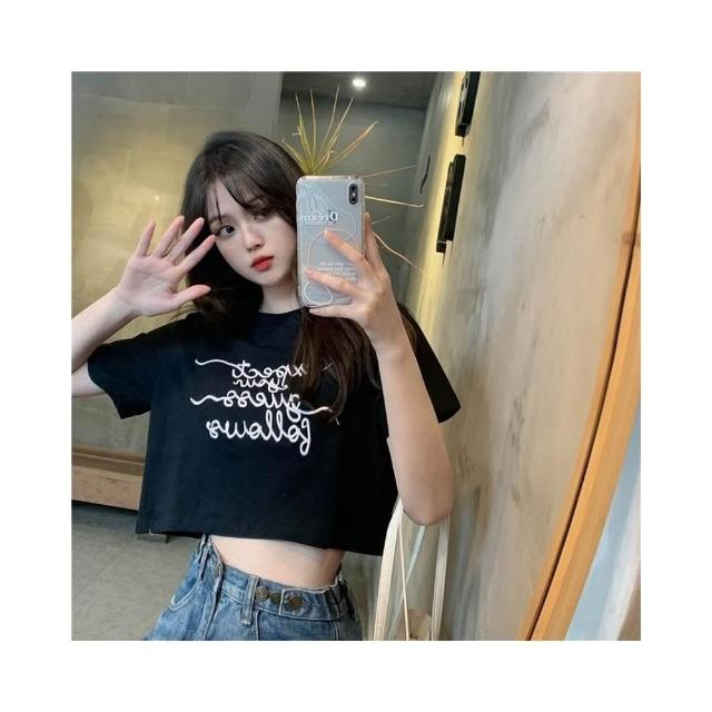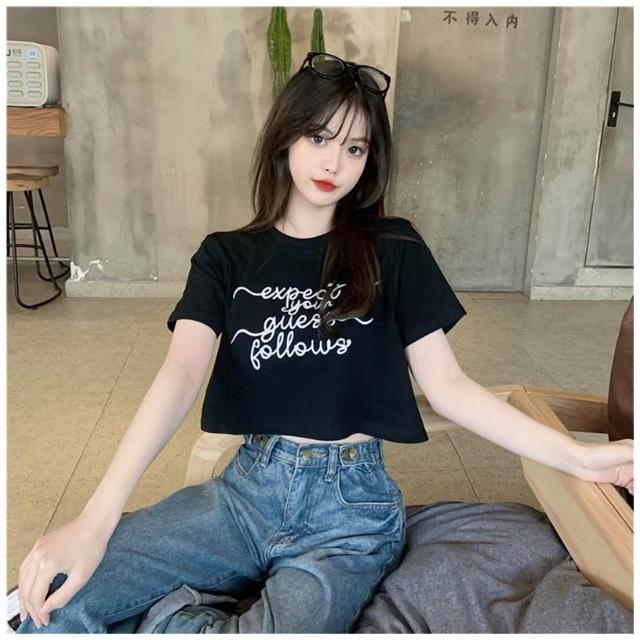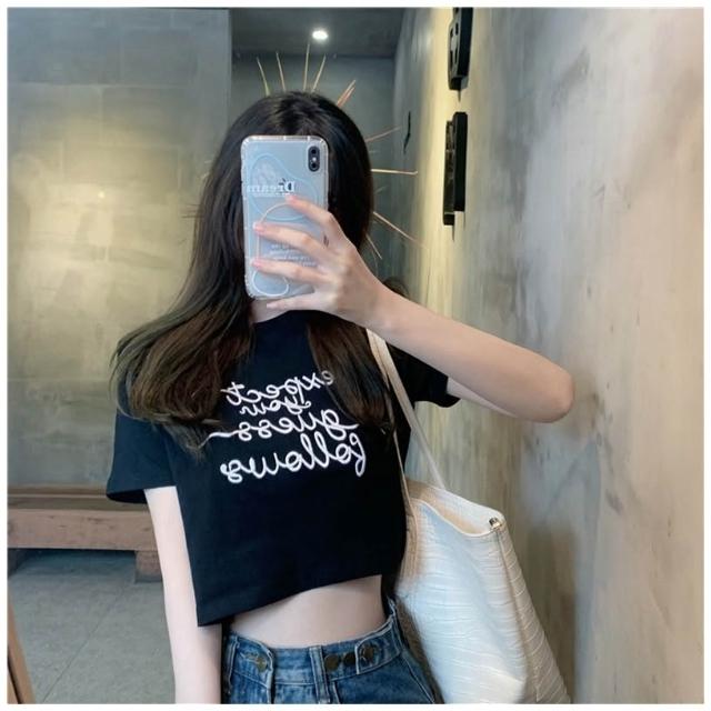 短版上衣 短版t恤 刺繡 t恤 短袖T恤 女夏季小個子 修身上衣 短版女裝 高腰 露臍上衣